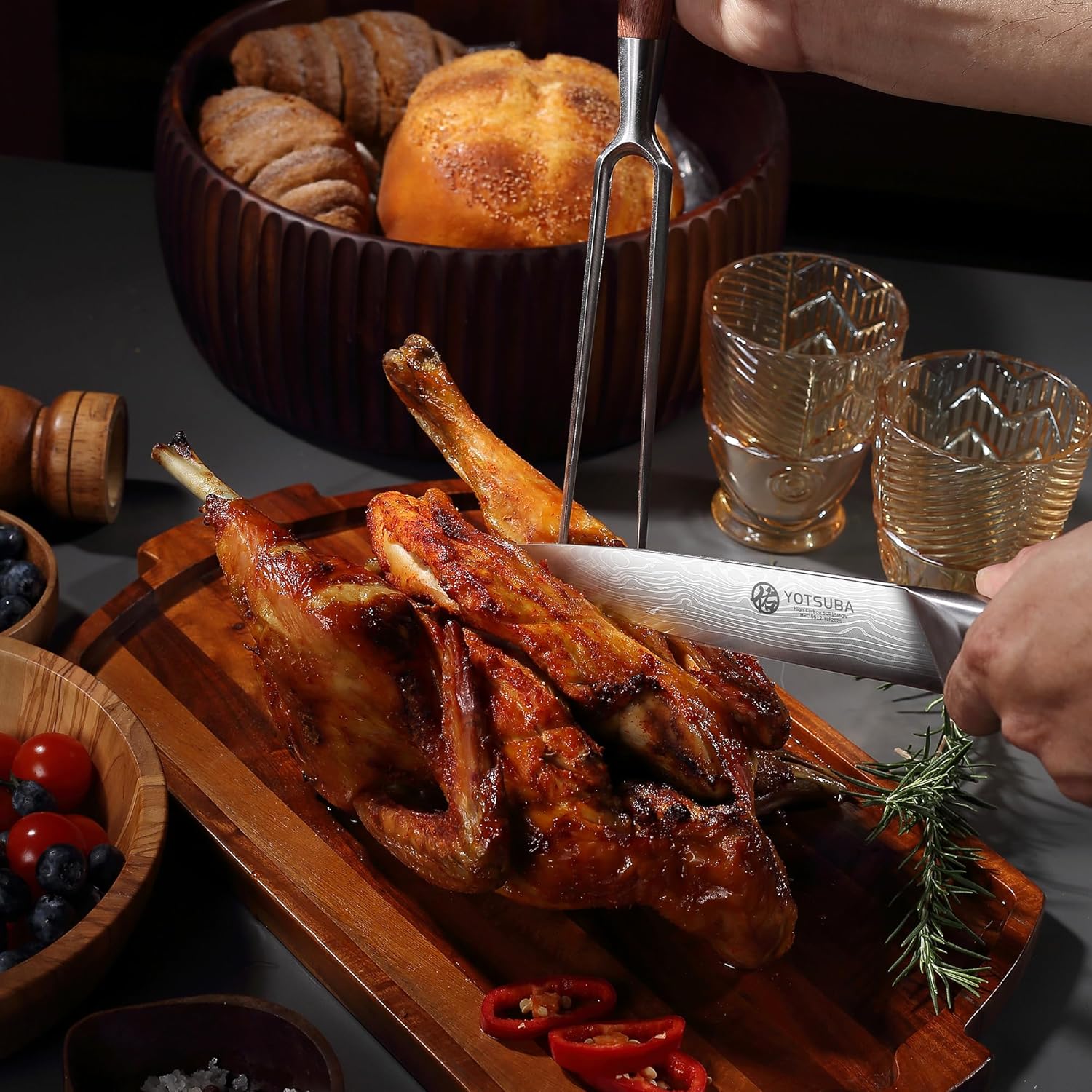 - CARVING KNIFE AND FORK SET: YOTSUBA carving knives and fork set featuring an ultra sharp 8" carving knife and a 7" carving fork designed for precision slicing and serving. It can be used for your daily kitchen tasks of chopping, slicing, dicing and mincing of all kinds of meat, vegetables, fruits and bread. It is suitable for both home and restaurant kitchens.Professional slicing knives will be your dependable companion, easy cooking effortless