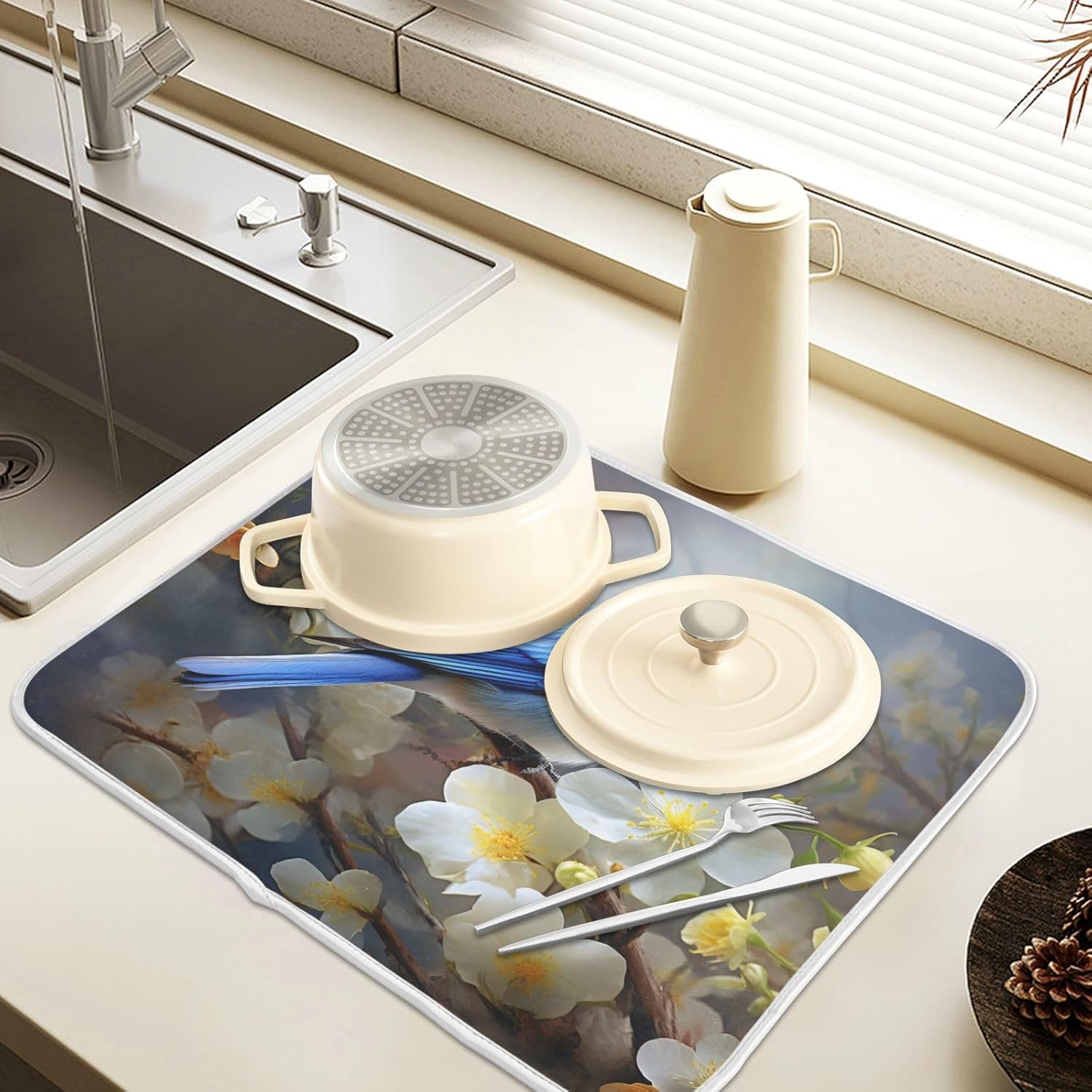 Spring Blue Yellow Flower Bluebird Butterflies Dish Drying Mat for Kitchen Counter Absorbent Microfiber Large Drying Pad Dish mats for Kitchen Countertops 18 x 24 Inch