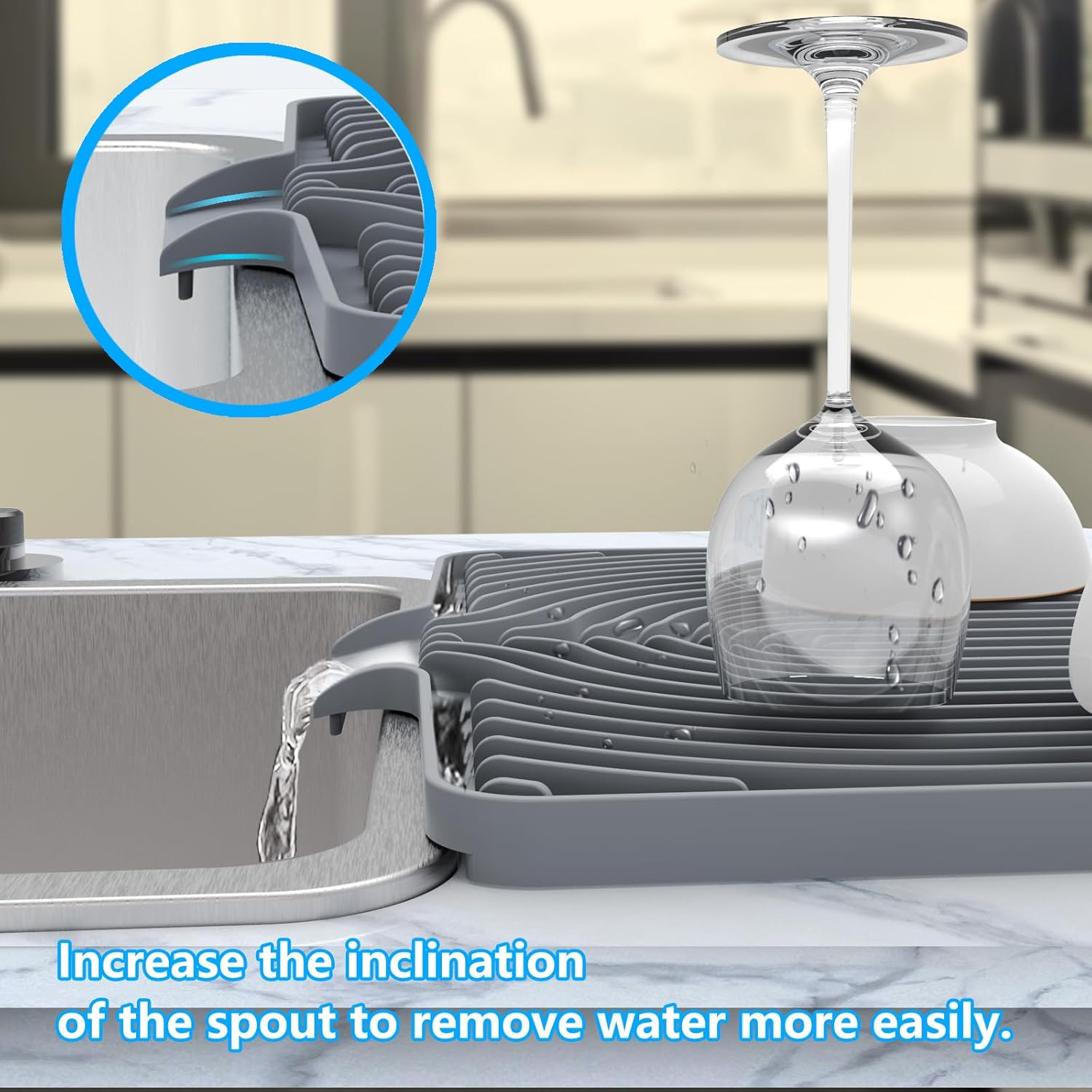 Kitchen Drying Mat for sink with a bulged edge,18"×12"Silicone Dish Drying Mat with built-in Drain Spout, Rubber Dish Mat for Kitchen (18"×12"gray)