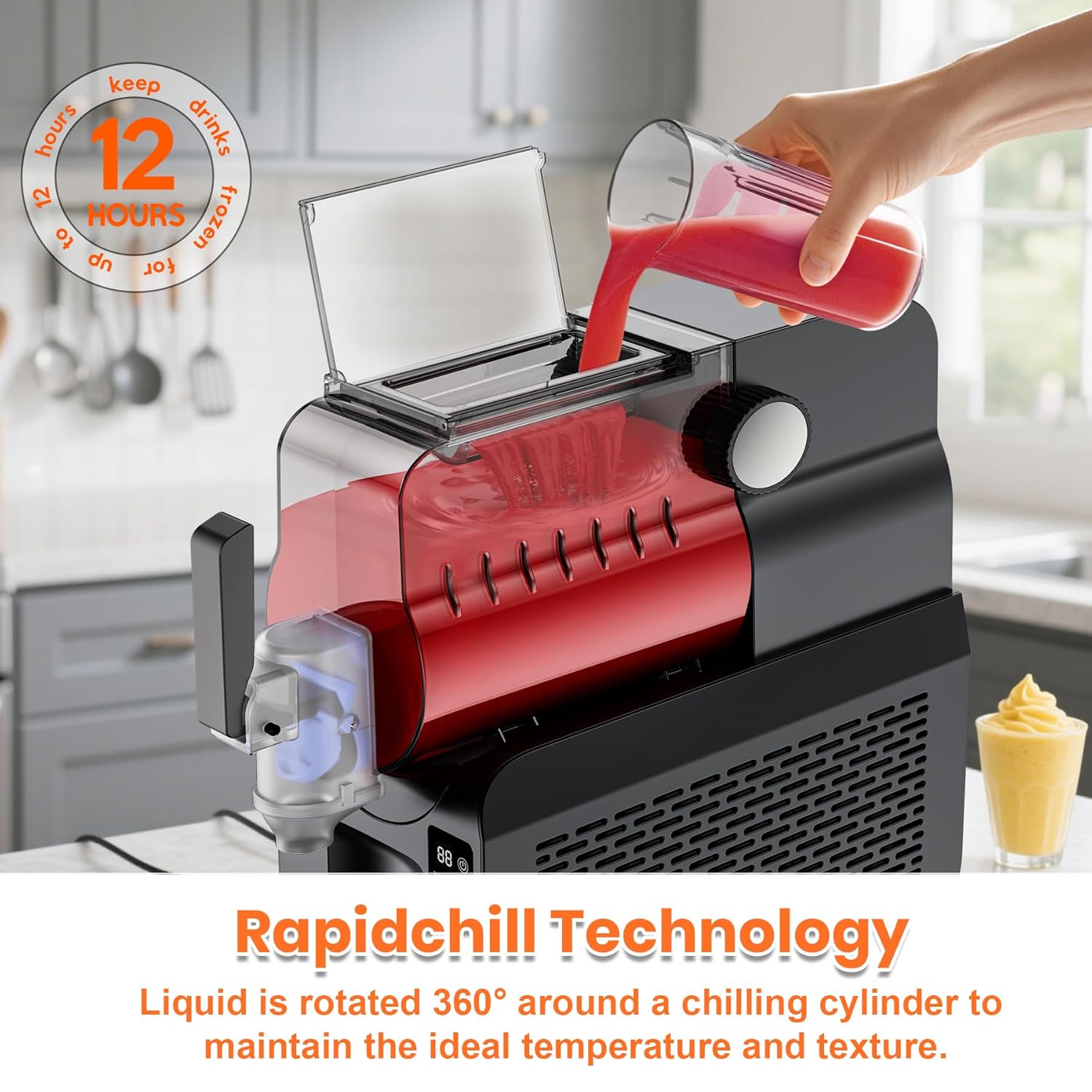 - No Ice Required, Easy to Create Smoothie Miracles. Imagine making refreshing smoothies without ice cubes on a hot summer day. Just pour sweet juice, milk, coffee or cocktail into the slushie machine, add the right amount of sugar or alcohol according to the recipe, press the button, and magic will happen immediately. Innovative cooling technology condenses liquid directly into smoothies, saying goodbye to melting and dilution, perfectly retaining the original flavor of the drink. No refrigerator required, no waiting, allowing you to enjoy your exclusive cold drink time anytime, anywhere.