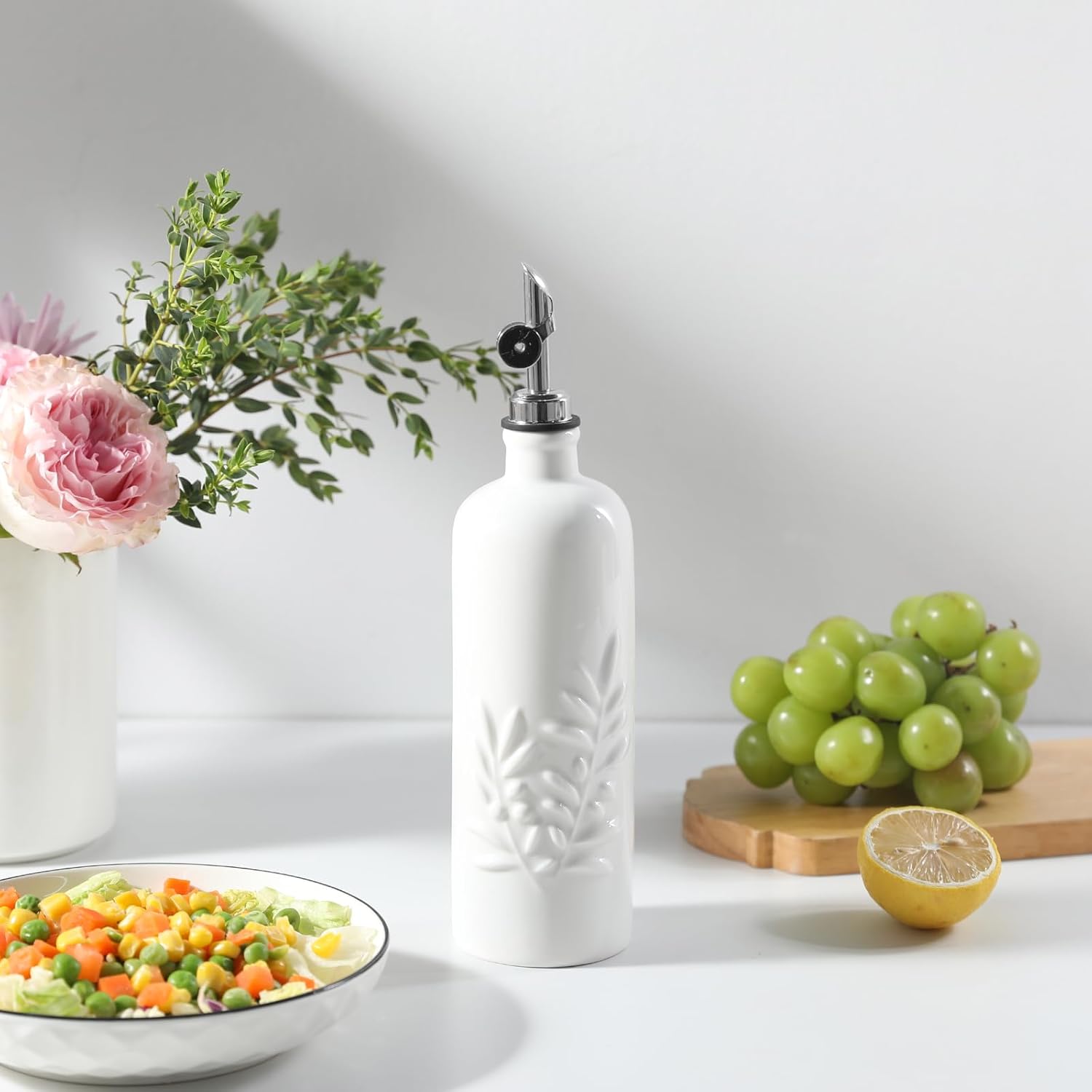 Sweejar 18 Oz Oil Dispenser for Kitchen with Gravity Spout, Ceramic Olive Oil Dispenser Bottle, Relief Opaque Vinegar Container for Evoo, Vinegar, Soy Sauce, Pack of 1(White, Silver Spout)