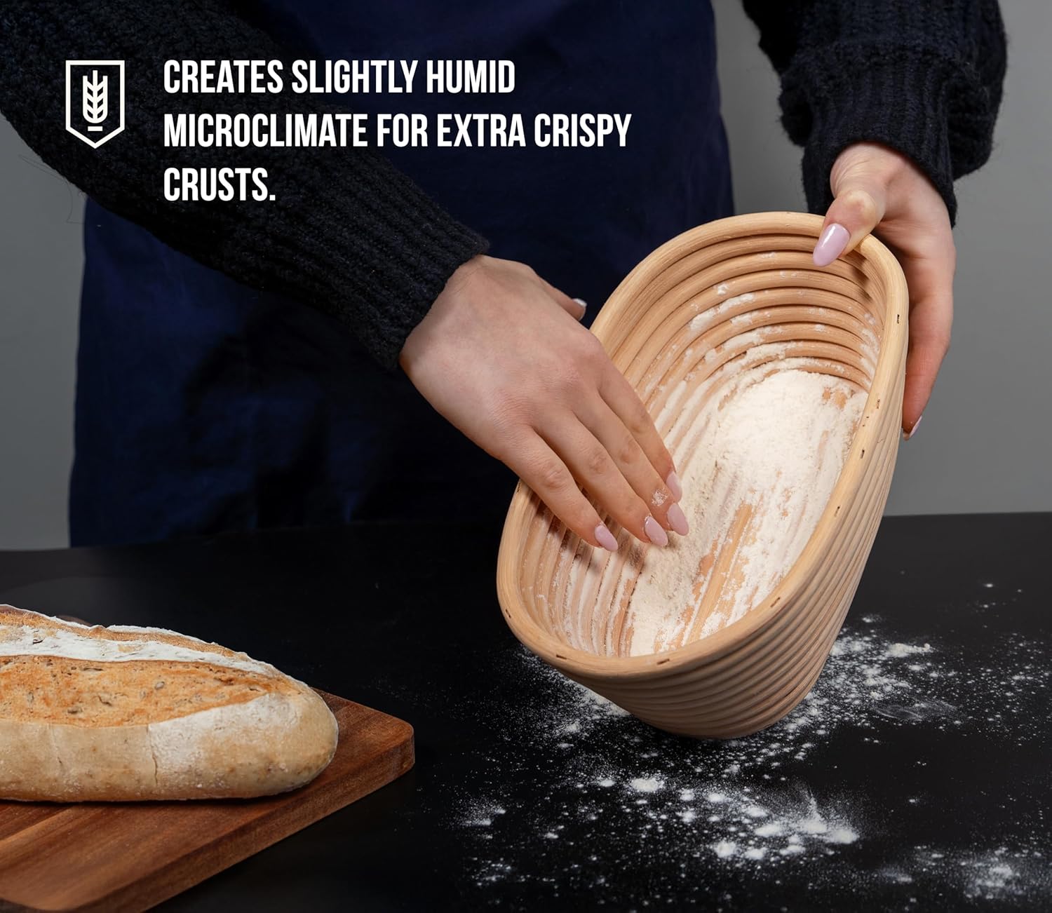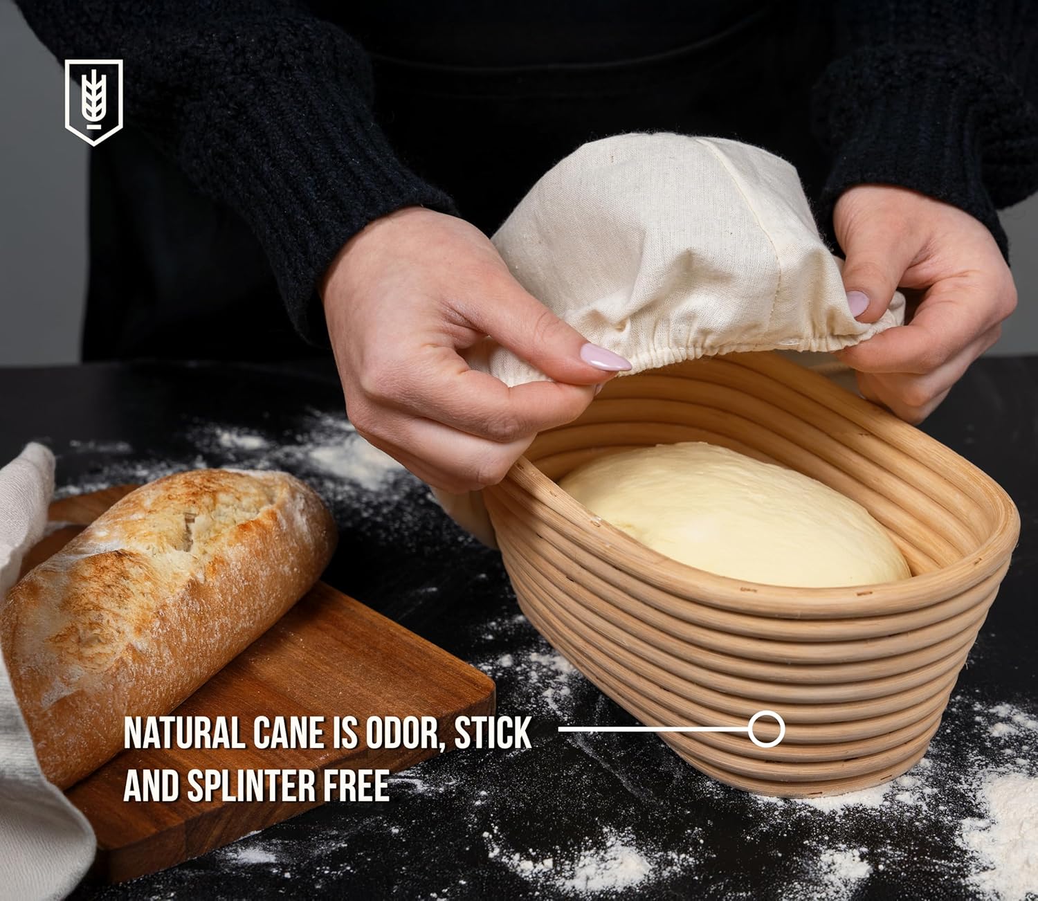 Kook Banneton Bread Proofing Baskets, Artisan Sourdough Bread Making Baskets, 9.8 Inch Handwoven Rattan Baskets and Cloth Liners, Set of 2, Oval