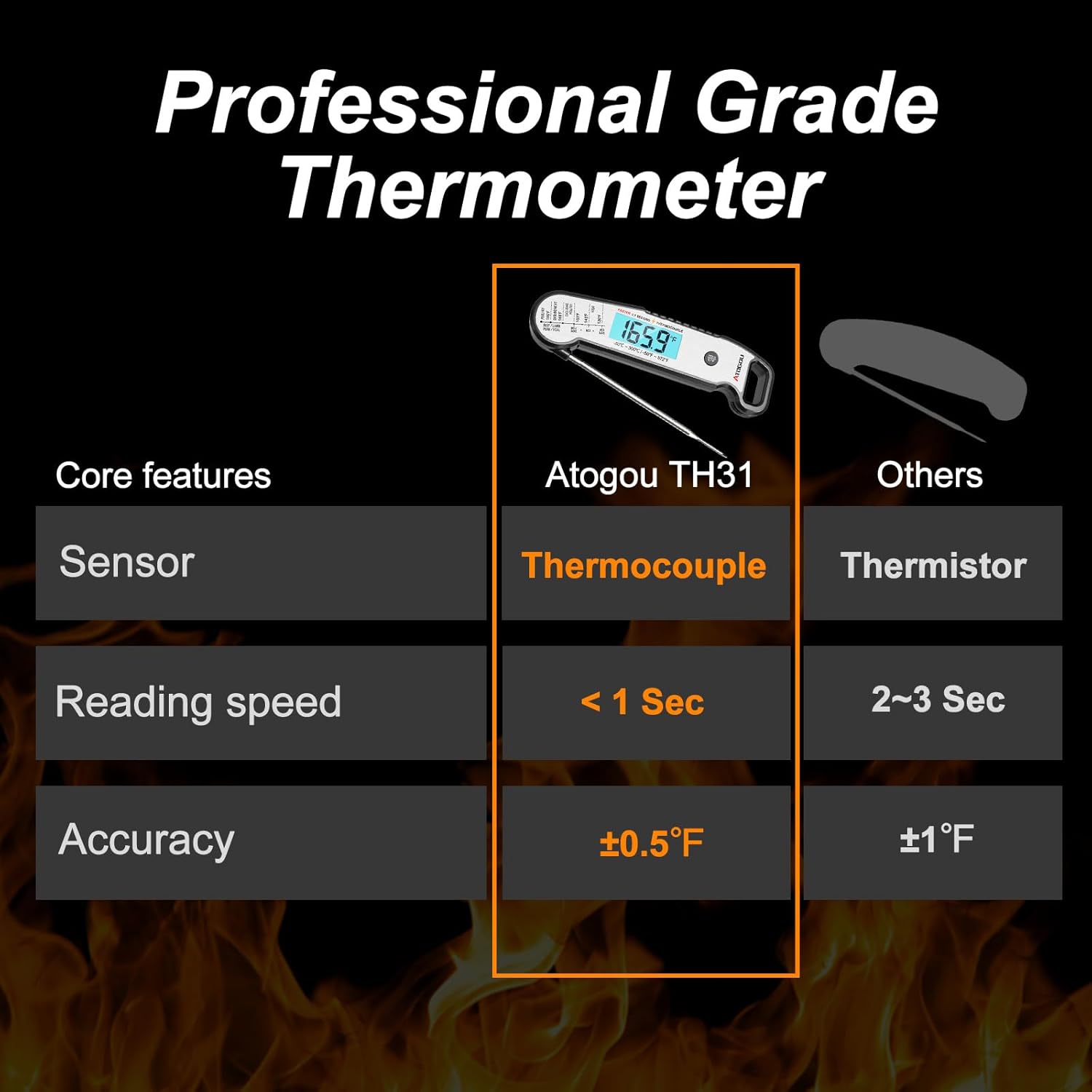 - [ Advanced Thermocouple Sensor ]: Equipped with advanced thermocouple sensors, this digital thermometer responds in under 1 second, which is 3X faster than traditional thermal resistance thermometers. This instant feedback ensures precise temperature control, preventing overcooking and delivering perfectly cooked meat