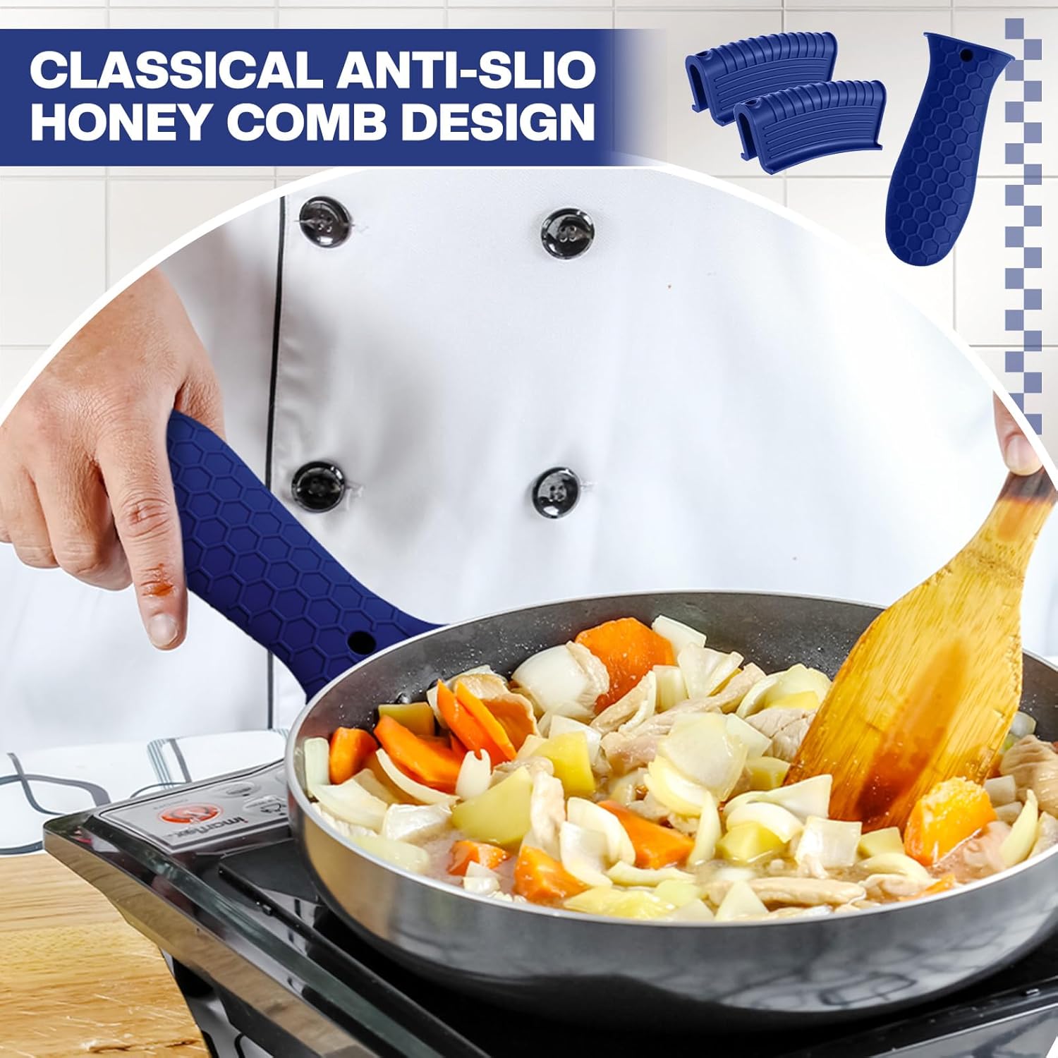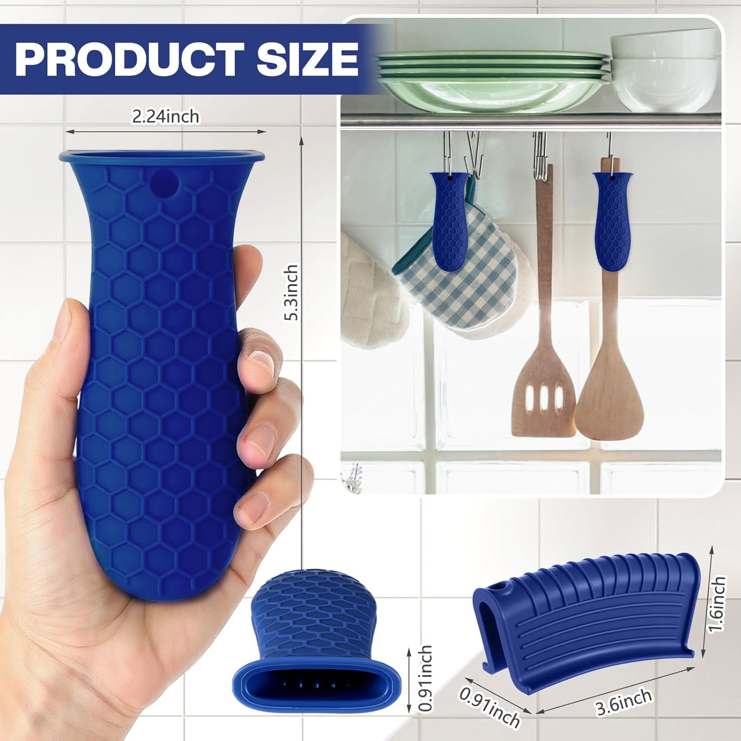 - Anti-slip Design: these hot resistant pot sleeve grip handle holders feature honeycomb pattern design on the outside and concave-convex design on the inside to make the handle holder grip stronger and less slippery; The silicone hot skillet handle cover has a handy hanging hole if you prefer to store on a hook, making cooking, baking, etc. in your kitchen easier and fun