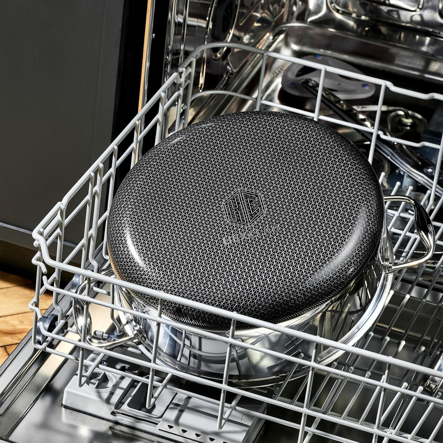 - Tri-ply construction with an aluminum core for quicker even heating, it’s safe to use on any home cooktop or stovetop, including induction. HexClad is metal utensil-safe, dishwasher-friendly, and oven-safe up to 900°F. (Tempered glass lids are oven-safe up to 400°F, while stainless steel lids are oven-safe up to 900°F.)