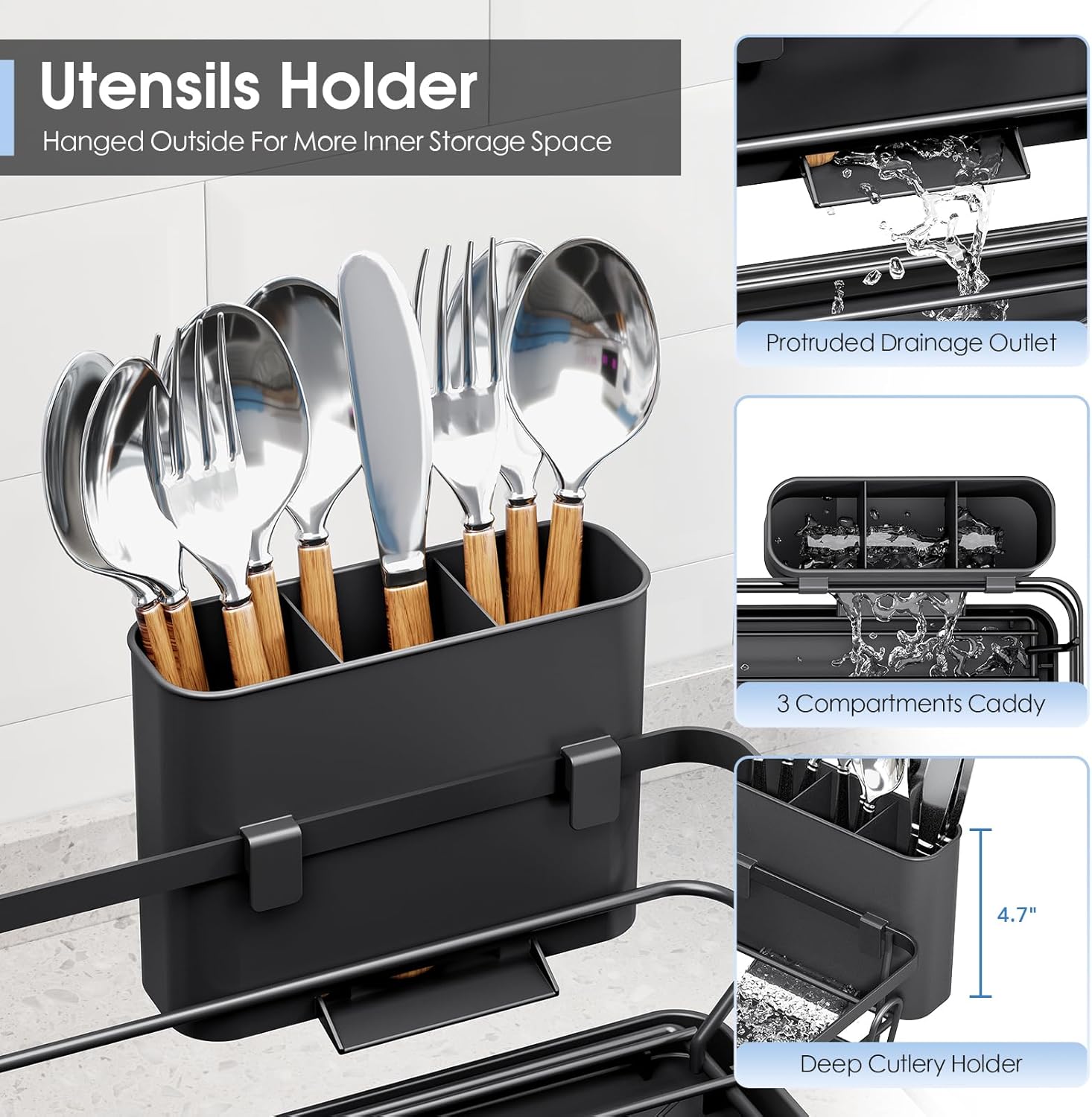 - [Efficient Drainage System]: Equipped with a long spout drainboard and innovative channel design, this dish rack prevents water accumulation and leakage. Your countertop remains clean and dry at all times.