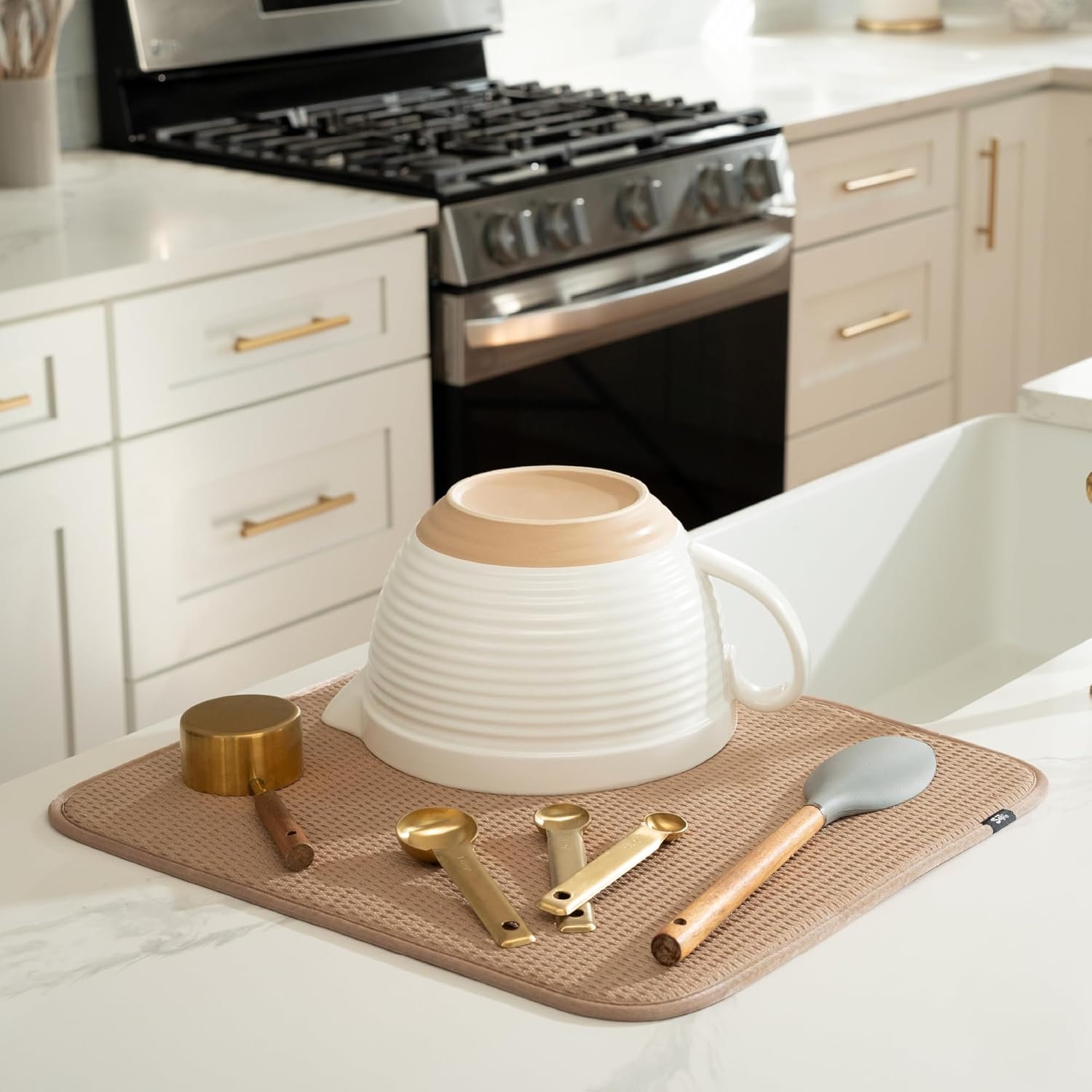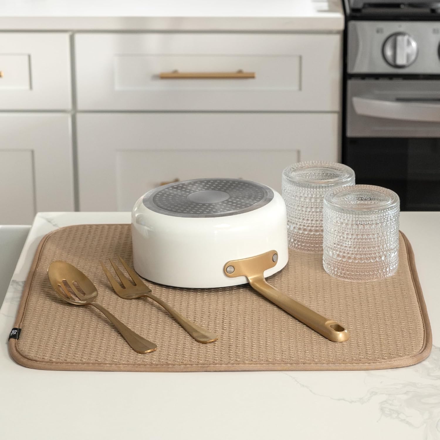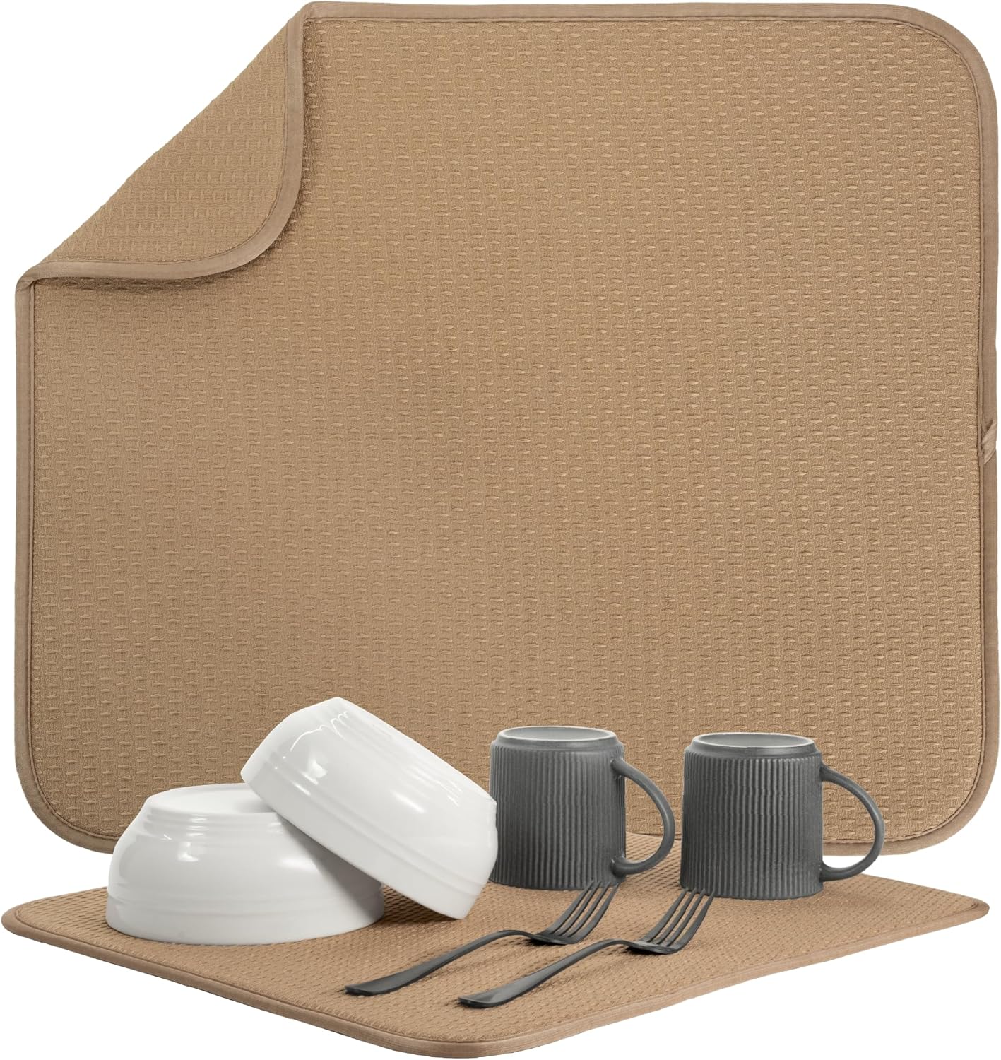 S&T INC. Dish Drying Mat, 16” x 18”, Absorbent Microfiber Kitchen Counter Mat, Drying Pad for Dishes, Utensils, Pots and Pans, Large, Diamond Texture, Almond