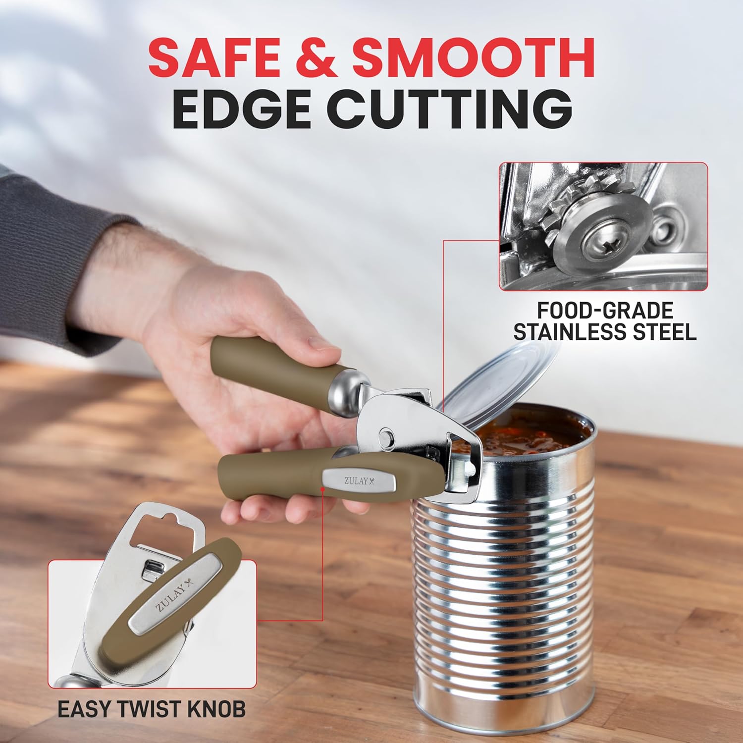 Zulay Kitchen Heavy Duty Stainless Steel Can Opener Manual with Bottle Opener - Rust Proof Manual Can Opener With Turn Knob & Comfy Soft Grip Handles - Brown