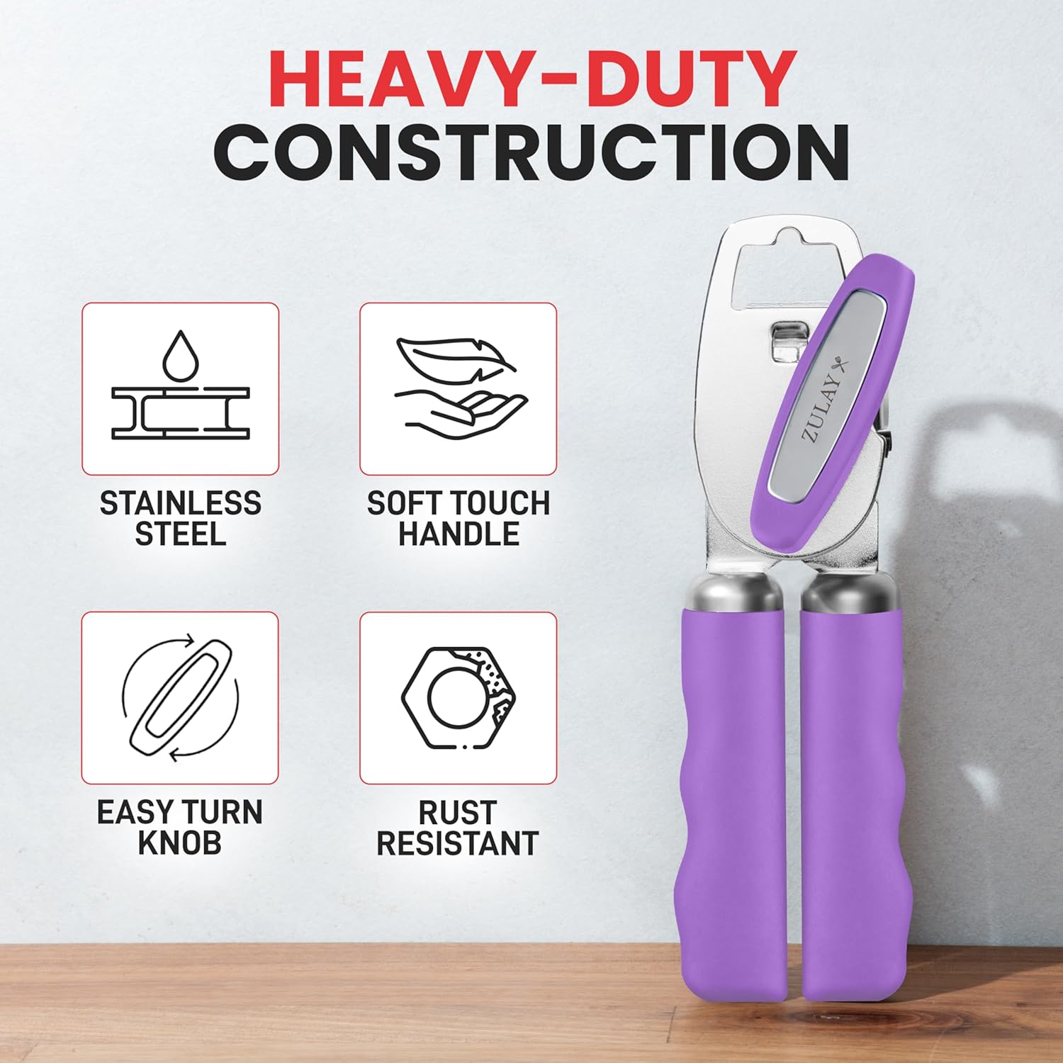 Zulay Kitchen Heavy Duty Stainless Steel Can Opener Manual with Bottle Opener - Rust Proof Manual Can Opener With Turn Knob & Comfy Soft Grip Handles - Purple