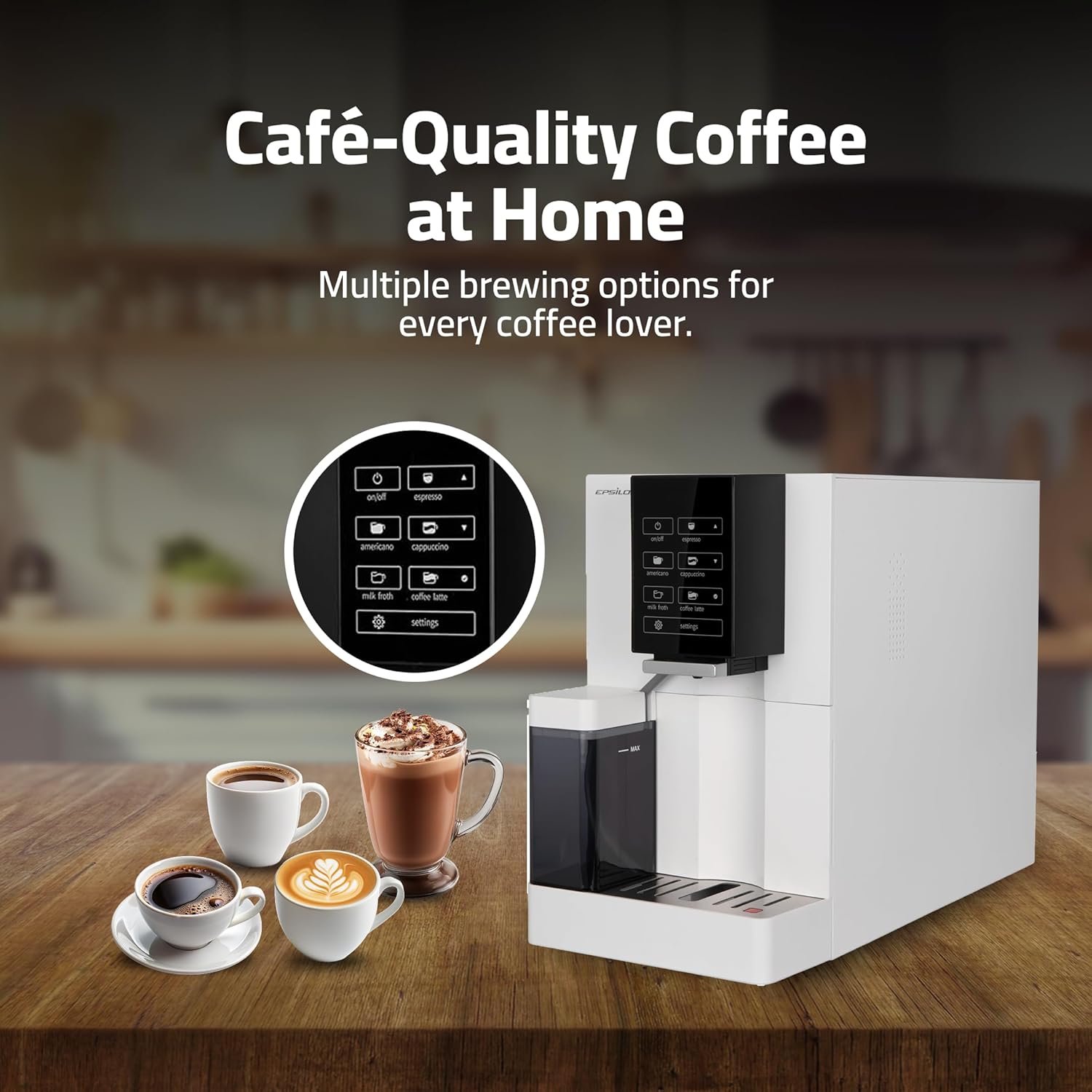 Epsilon Fully Automatic Coffee Machine, Modern One Touch Espresso Machine, Integrated Milk Frother and Custom Brewing Cafe Maker, Compact Countertop Size, Self Cleaning Cafetera (White)
