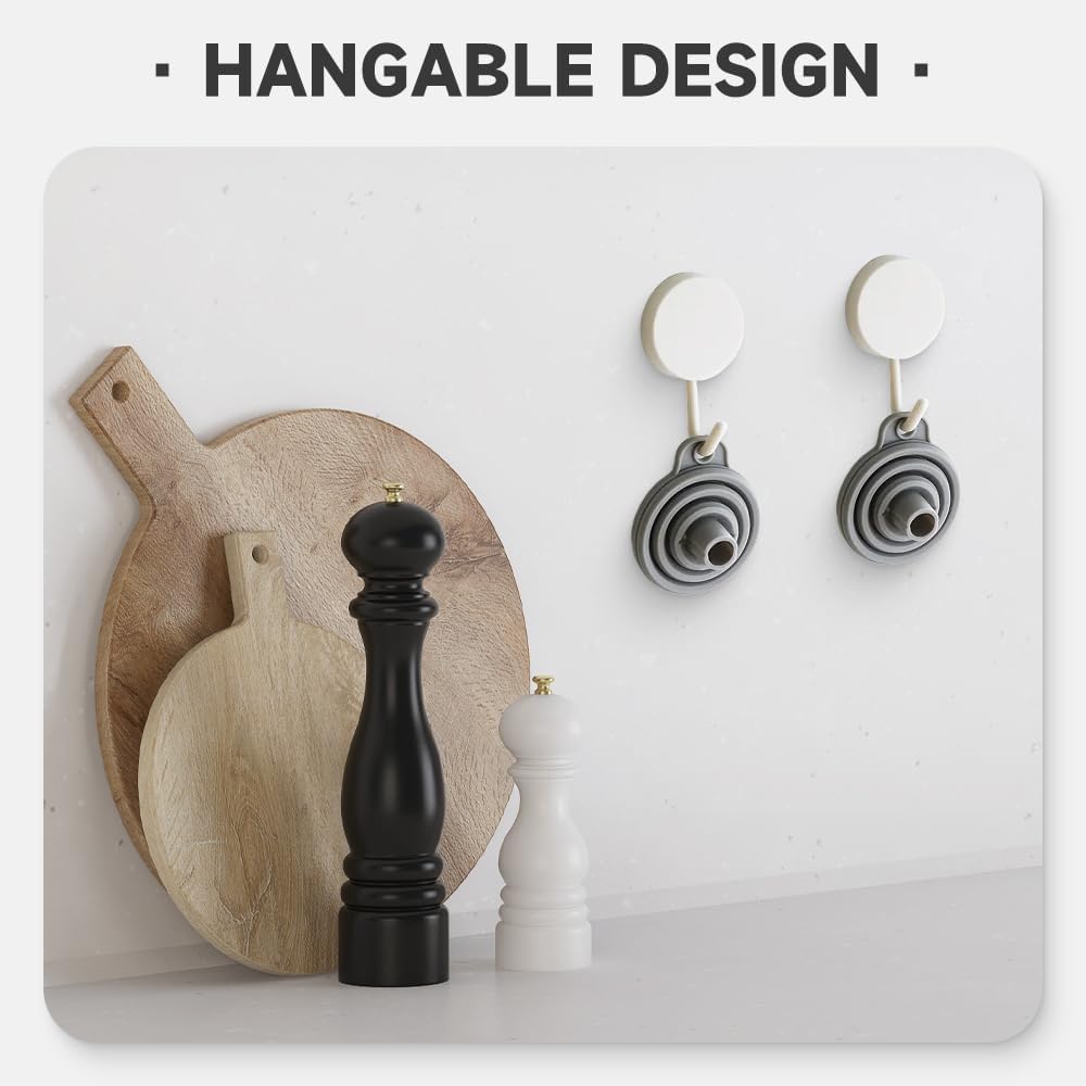 - Collapsible and Space-Saving Design: Each collapsible funnel in this silicone funnel set can be conveniently flattened into a compact shape, making these tiny funnels for filling small bottles ideal kitchen gadgets. The mini funnels for filling small bottles can be hung on walls or stored in drawers without taking up space.
