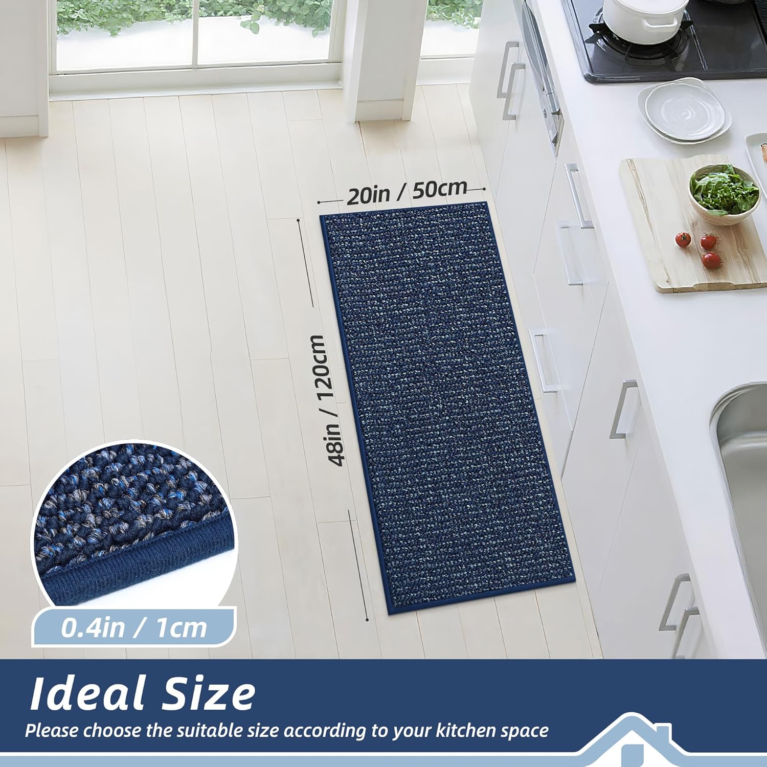 - Durable and Stylish: BEQHAUSE kitchen rugs are woven from multi-colored and solid-colored yarns, stylish and suitable for most kinds of kitchen dΓ©cor. The kitchen mat measures 20" x 48" x 0.4", tight sewing and extremely dense yarns ensure the kitchen rugs exceptional durability, superb absorbency, stain resistance and colorfastness
