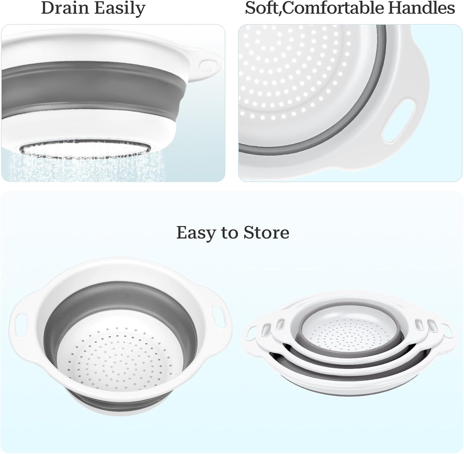 Collapsible Colander 3-Pack Set Space-Saving Foldable Kitchen Strainer with Non-Slip Base Durable Thickened PP+TPE Collapsible Strainers for Pasta, Vegetables, Fruits (Gray-White)