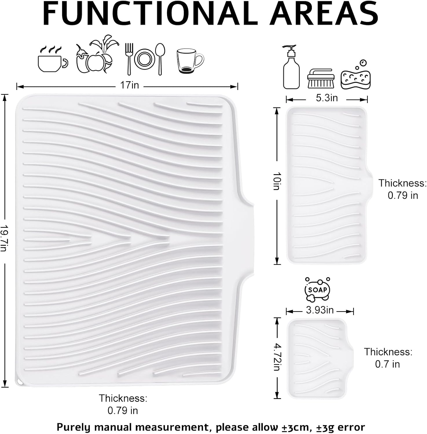 - Quick Dry Mat: The TIKNIK dish drying mat comes in 3 sizes, including a larger design up to 19.7" x 17", for washing dishes to air dry. The quick dry dish mat's foldable design and innovative design allow air to circulate under the dishes, and features unique diagonal ridges to easily remove moisture, and a specially designed edge that allows water to drain directly into the sink. This keeps your countertops dry and clean, and says goodbye to the trouble of wet countertops.