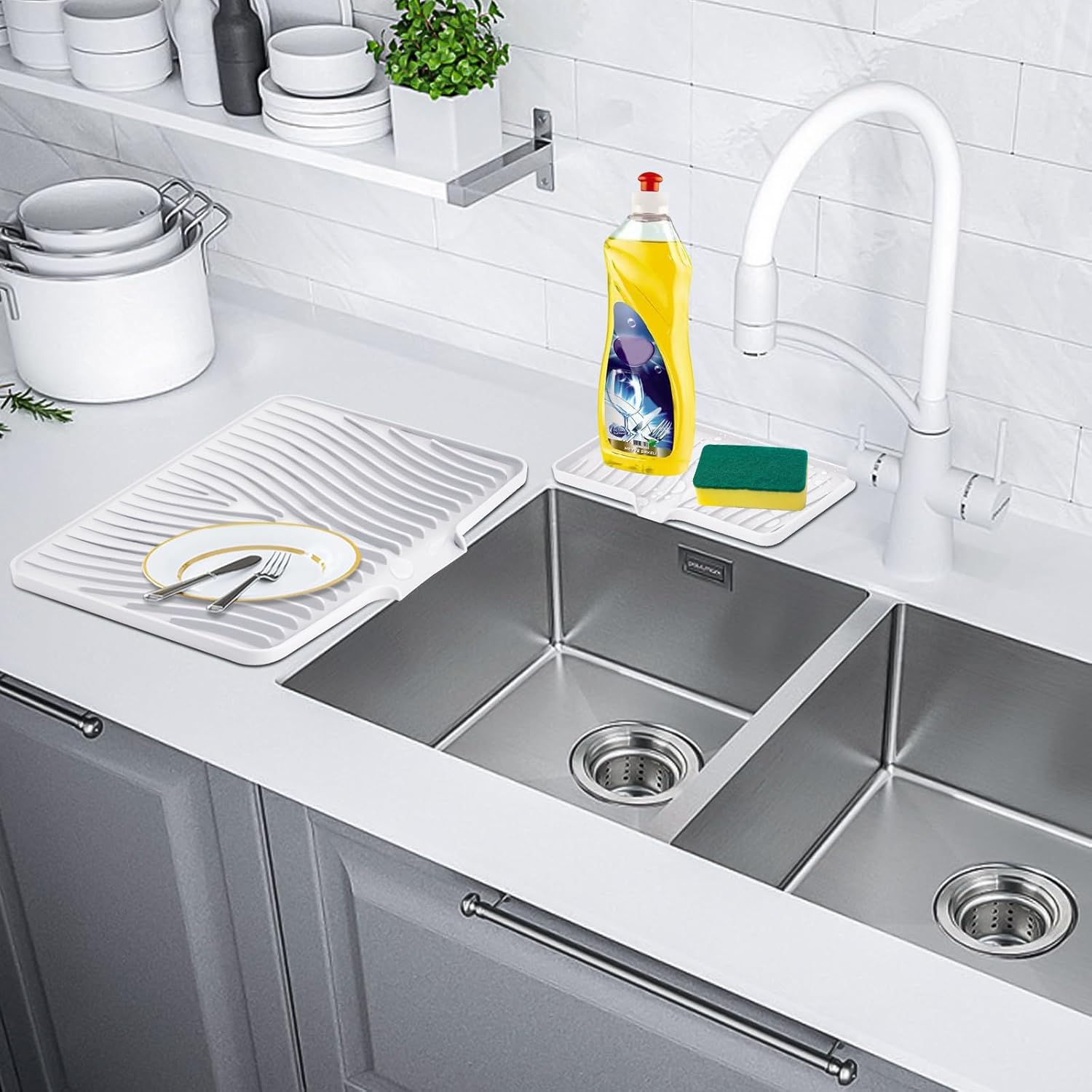Silicone Dish Drying Mat for Kitchen Counter, Dish Drying Pad, Non-Slip Drain Pad with Built-in Drain, Heat Resistant Stone Drying Mat, 1 set (Ivory)