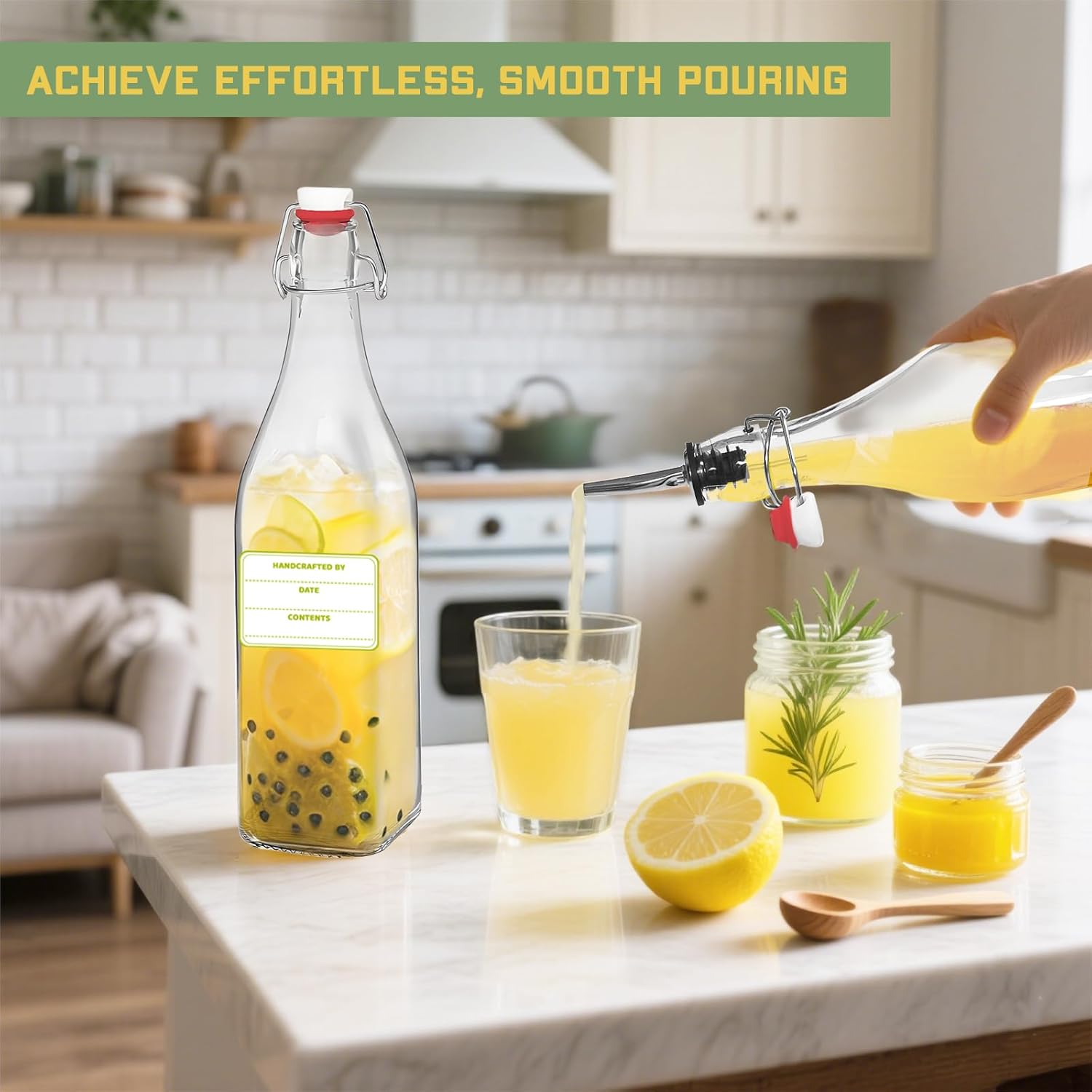 - Versatile & Multi-Purpose Use: Perfect for storing juices, vinegar, oils, kefir, wine, liquor, and more. The 1 liter square glass bottle capacity is ideal for home brewing, parties, or everyday use. Includes a stainless steel funnel and 2 pourers for easy filling and serving. Great for mead bottles, limoncello bottles, and kombucha jars.