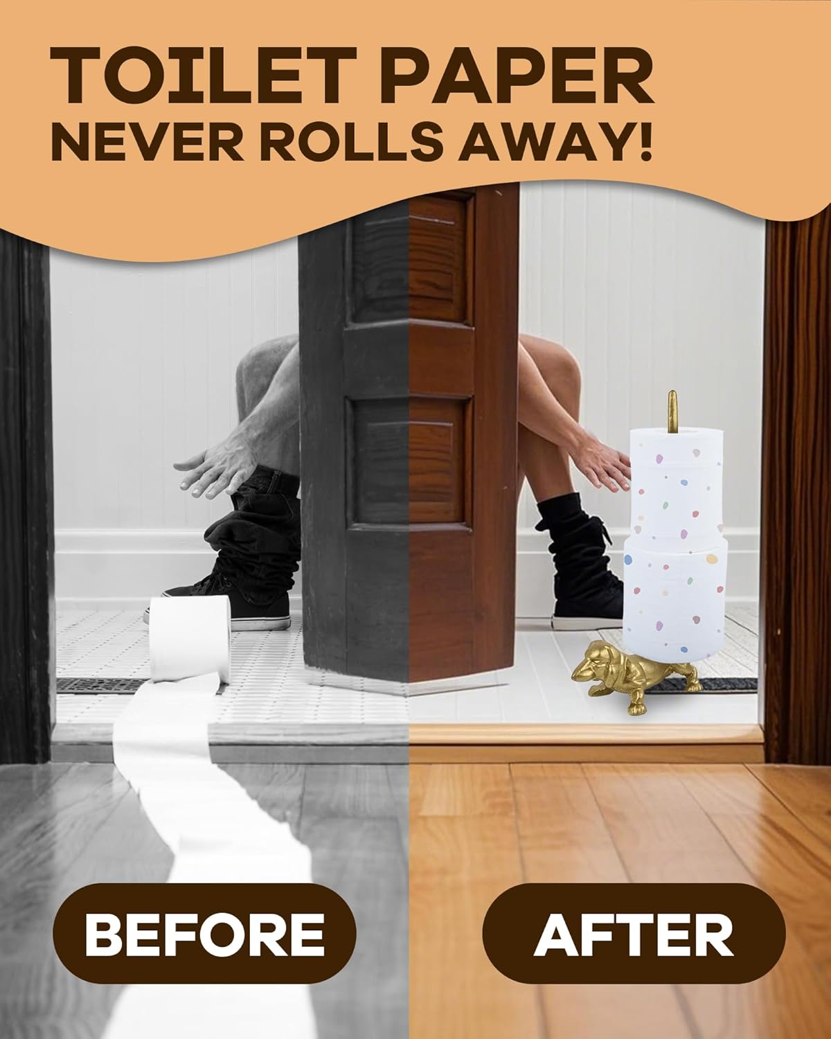 - š CHARMING DOG DESIGN WITH STABILITY - Crafted from solid cast iron with elegant gold electroplating, this freestanding paper towel holder features a 1,450g (3.2lbs) weighted base preventing tipping while adding adorable charm to your space. Perfect bathroom or kitchen countertop accessory that combines function with style.