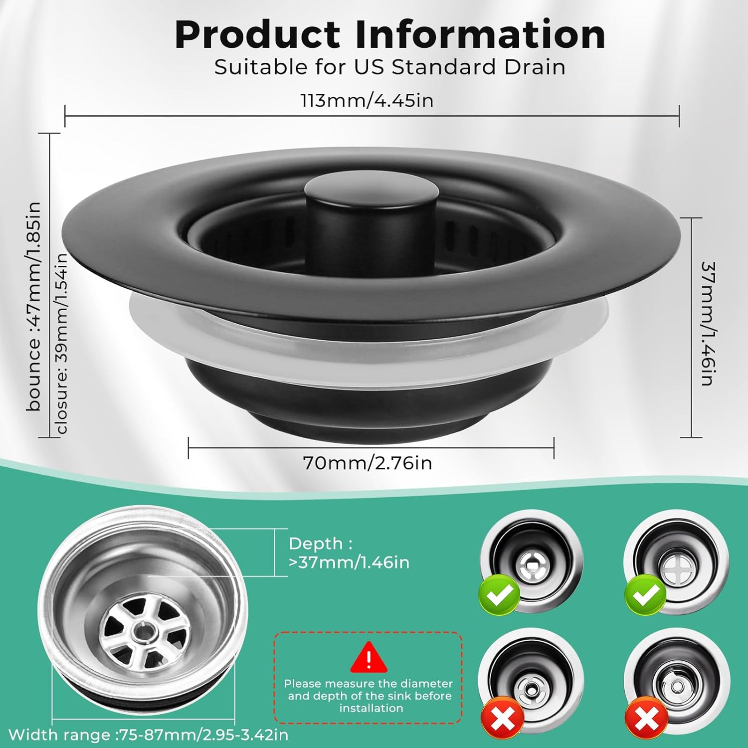 - Specification Size: Our sink drain strainer can be applied to most US standard sink drains, with widths ranging from 2.8 inches to 3.4 inches and openings deeper than 1.4 inches. It is compatible with US standard 3-1/2 inch drain pipes. Please measure the size of your sink before use to ensure that your drain diameter and depth meet this specification