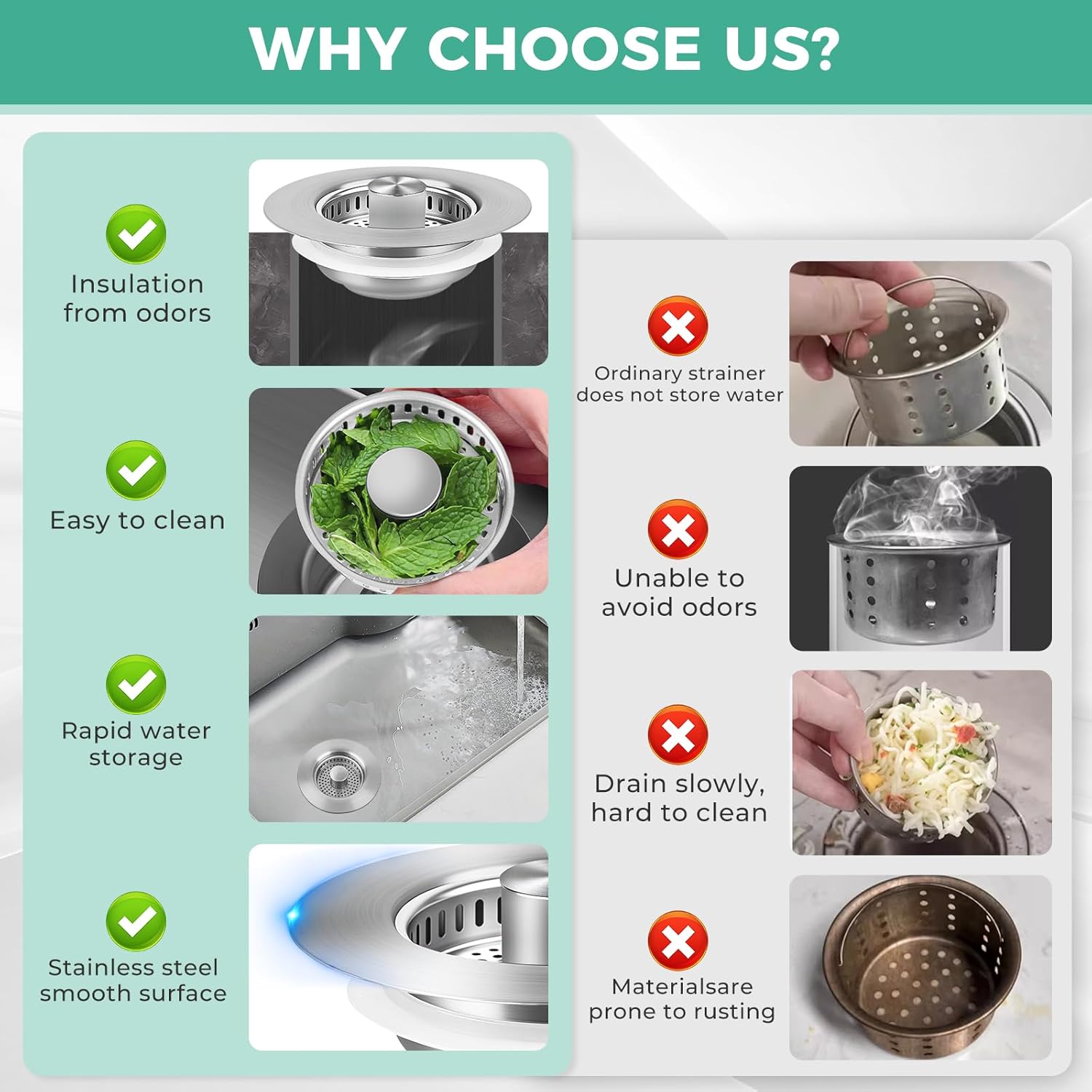 - 3 in1 Multifunctional:This sink drain stopper integrates the functions of water storage, drainage and odor isolation in one. The full stainless steel material and sealing gasket can ensure the tightness when storing water and effectively isolate the drainage odor during use. The small holes on the pop-up stainless steel plug can easily capture food residues without hindering the easy passage of water, effectively avoiding clogging of the kitchen sink pipe, fully meeting your daily kitchen use needs