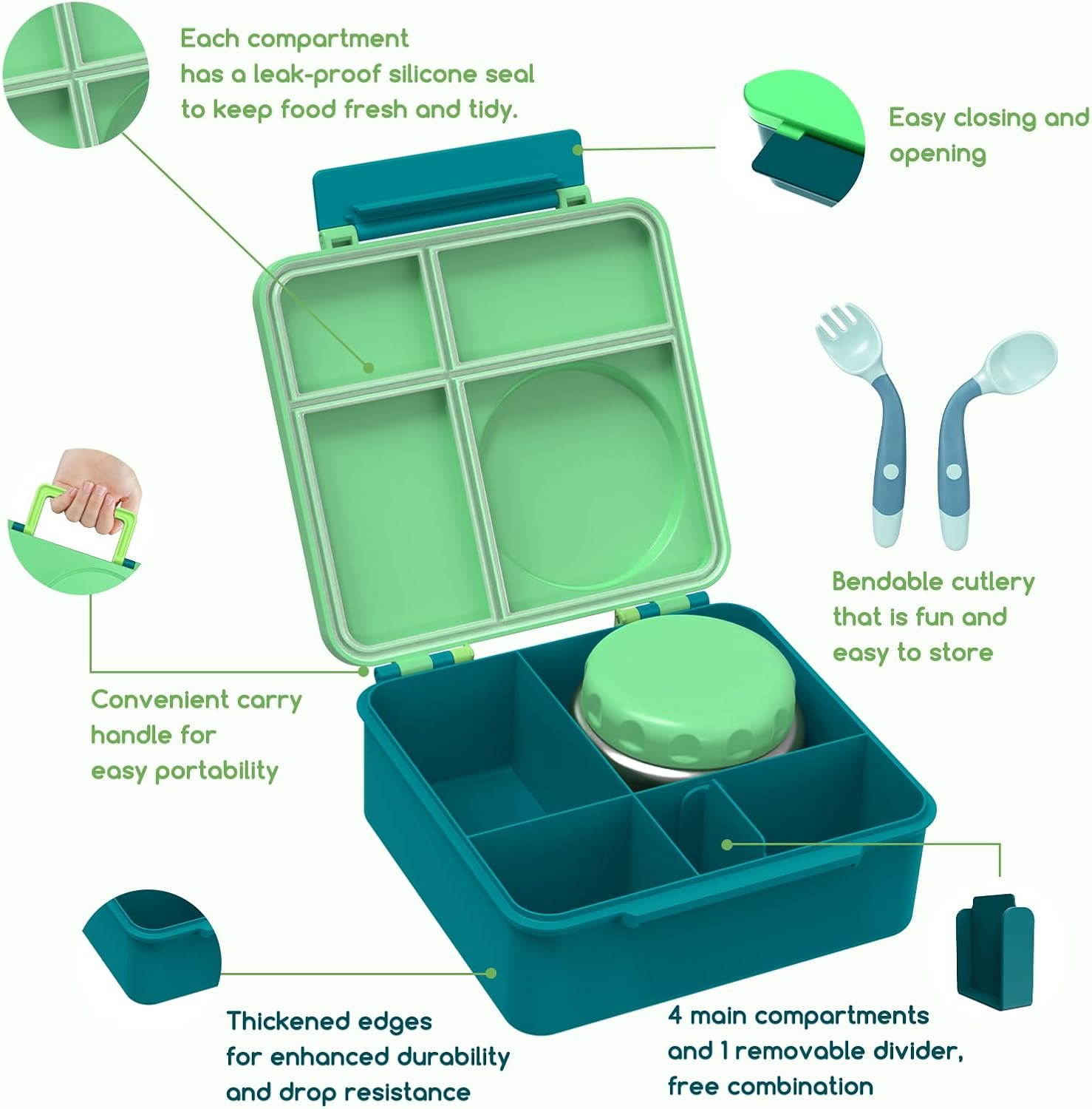Bento Box for Kids - Leak-Proof Lunch Box with Insulated Thermos Food Jar - 4 Compartments, 1 Removable Divider, 1Spoon, 1 Fork - Dishwasher Safe, BPA-Free (Green)