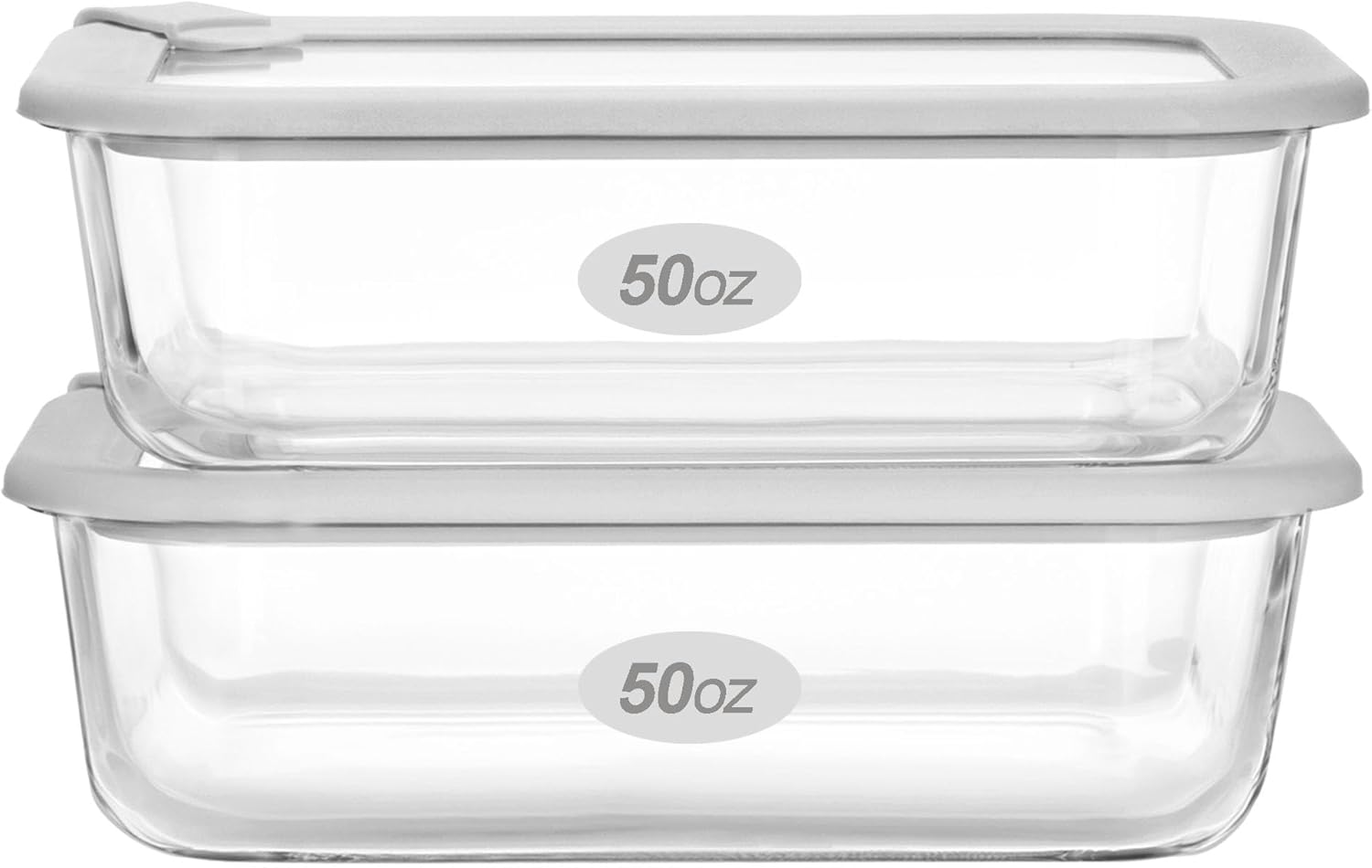 - ✅2 PACK LARGE COMBO: Each set comes with the glass containers and grey silicone framed glass lids. Size : 50oz, (6x8x2.5)