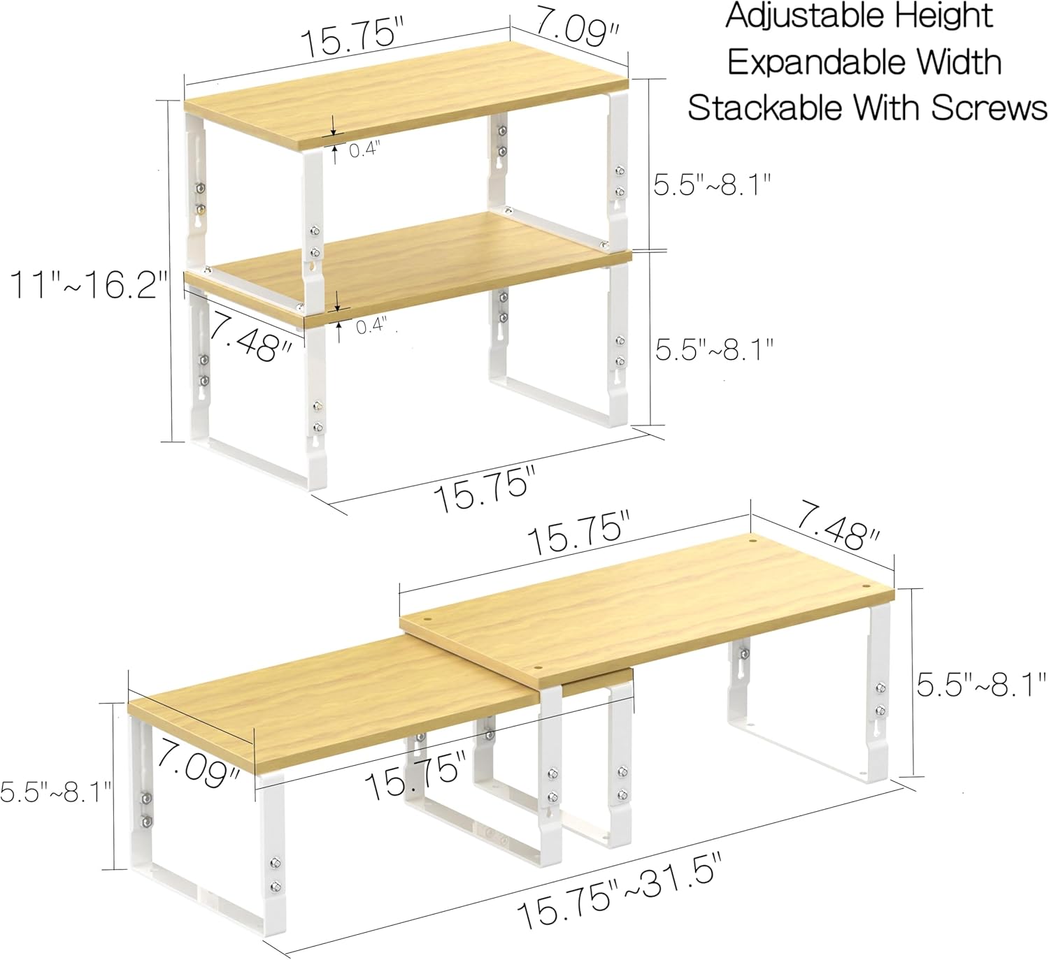 Expandable Kitchen Cabinet Organizer Shelves – Stackable Adjustable Metal and Wood Storage Racks for Countertop, Pantry, Garage Set of 2 Spice Rack – Easy Assembly, Space-Saving(2 Packs/Large/White)