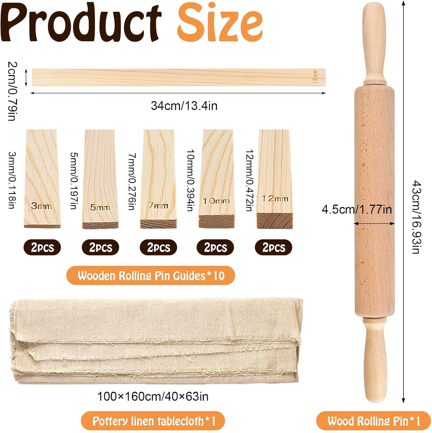 - Package Contents: You will receive 20pcs of pottery tool kit, including wood rolling pin * 1, pottery linen tablecloth * 1 (100×160 cm/40×63) in) ,wooden polling pin guides*10 (3/5/7/10/12 mm*2) and 8pcs of clay sculpting tools.Please confirm the size before purchase