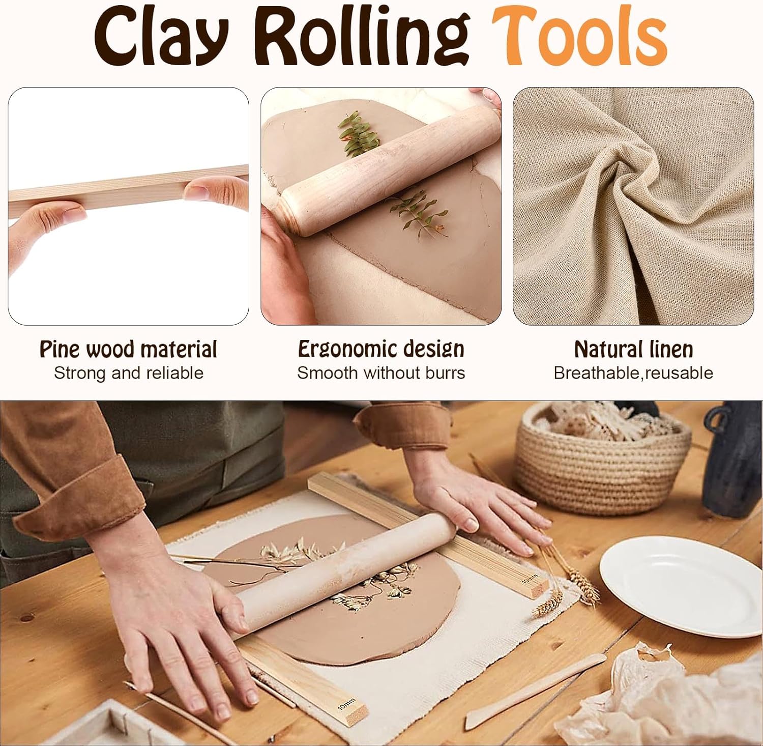 - Pottery Tool: The wood clay roller and polling pin guides are made of thickened beech and pine wood, the surface has been polished without any burrs. The natural material linen cloth has strong toughness and breathability, you can use these pottery tool to press uniform ceramic blanks