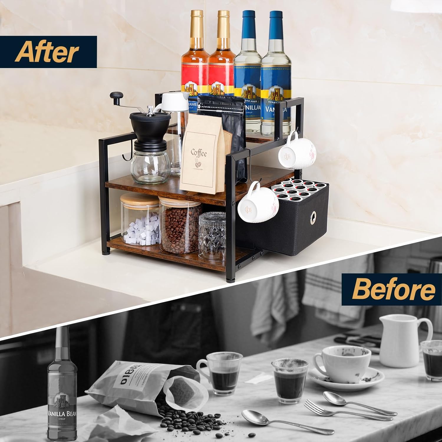 - Maximize vertical space! The 3-tier coffee syrup rack securely holds 12 bottles (750ml) with cascading design, freeing up 50% more countertop real estate. Features a silent slide fabric drawer (side-mounted) to stash straws & sugar packets—keeping dust out and surfaces spotless.