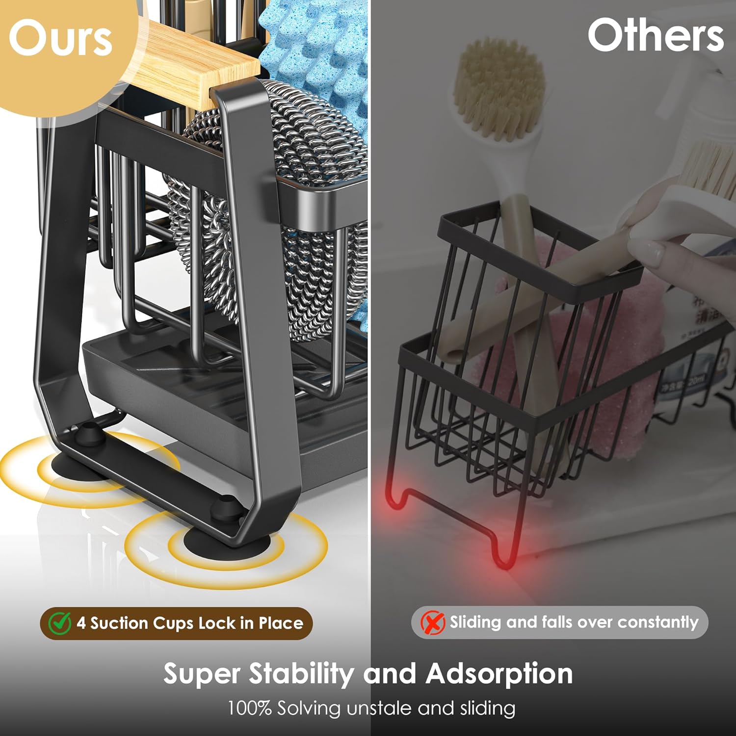 - ăRapid Self-DrainingăThe sink caddy kitchen sink organizer's patented V-Drain Channel and extra-long 3.15 in spout directs every drop straight to the sink. Keeps your kitchen sponge holder clean and dry. An Ideal kitchen organizers and storage for tidy countertops.
