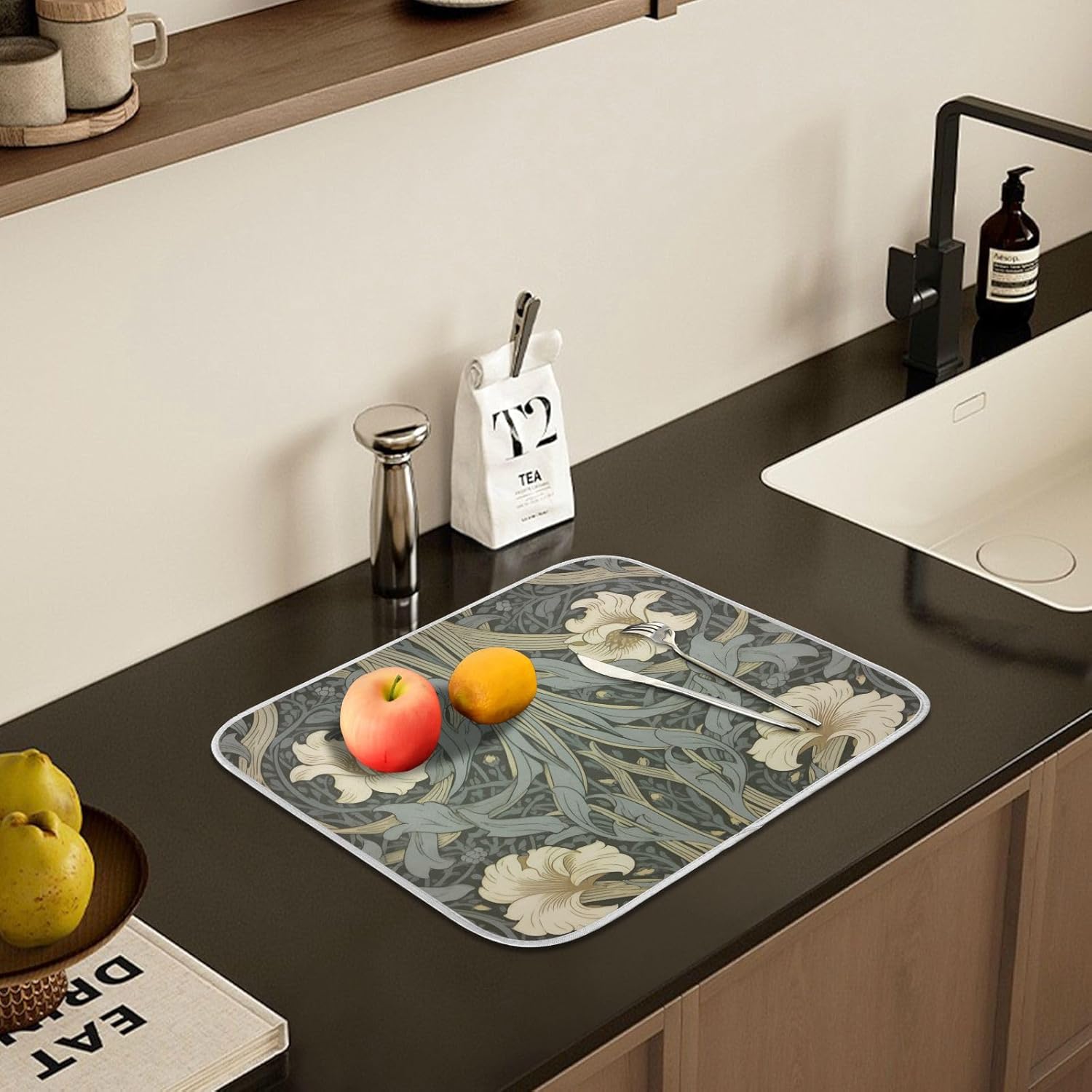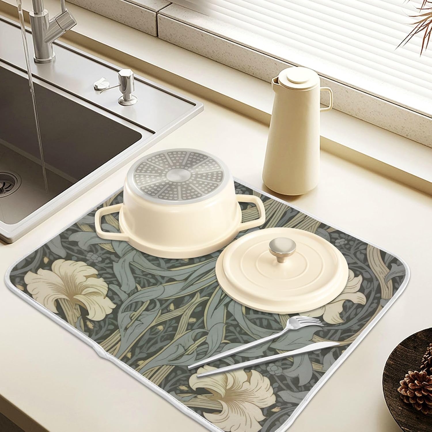 William Morris Flowers Print Dish Drying Mat for Kitchen Counter Absorbent Microfiber Large Drying Pad Dish mats for Kitchen Countertops 18 x 24 Inch