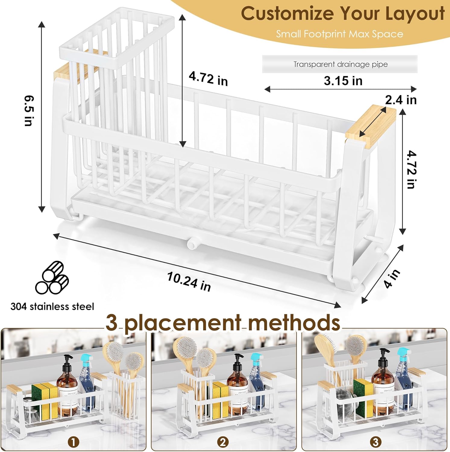 - ăSmall Footprint Max SpaceăOur kitchen countertop organizer has upgraded the height of the brush rack storage part and adopts a unique engineering design. It measures only 10.24"*4"*6.88"ïŒthe same size can hold 30% more capacity than standard racks,and can flexibly hold more detergent bottles ,types of brushes and other items. No more choosing betweenâsponges or detergentsâlike others!