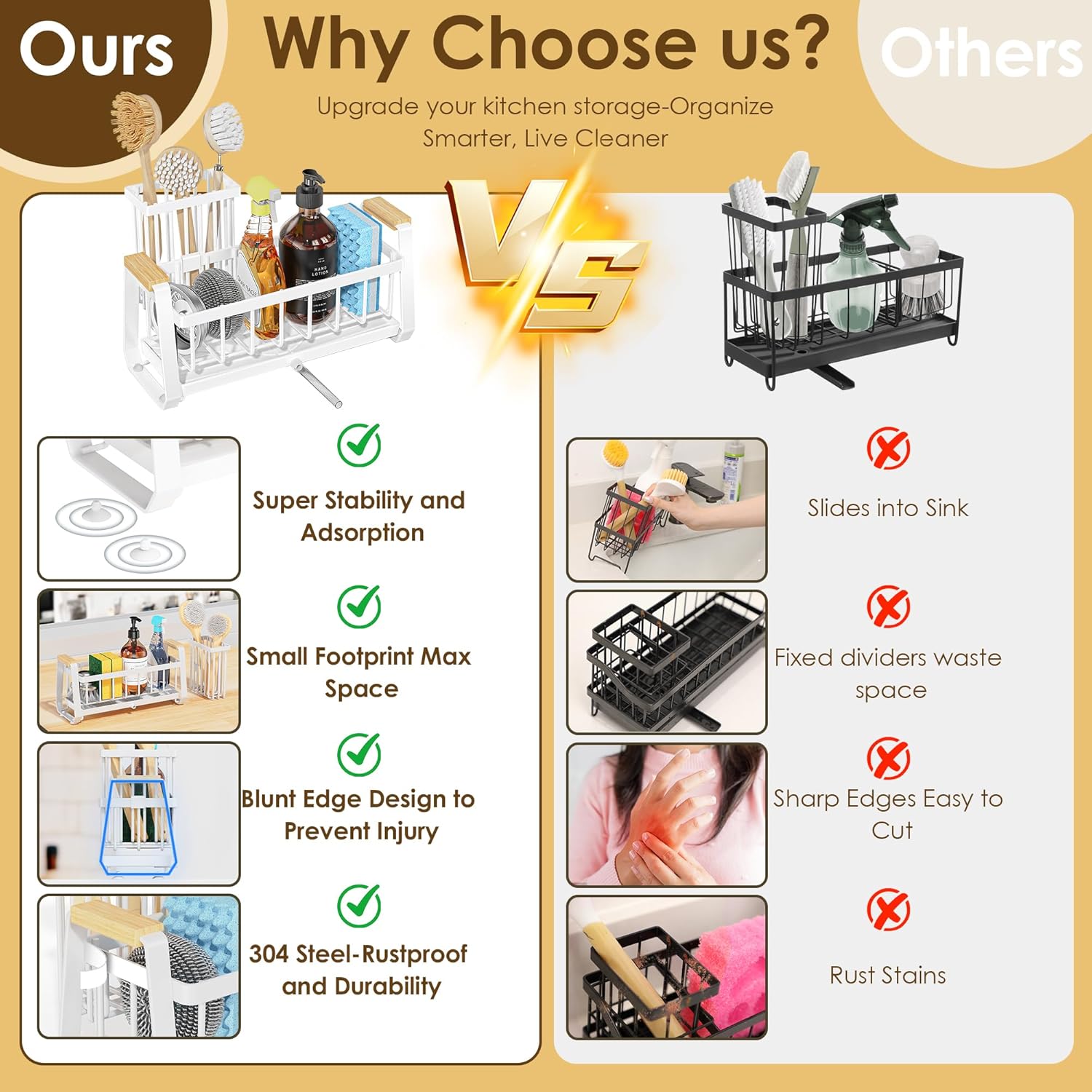 - ă304 Stainless SteelăDoasuwish kitchen sink organizer is made of 304 stainless steel.Rustproof and stays like new-Lab tested to resist rust, stains, and fingerprints. Unlike other sink caddy that corrode and stain your countertops, ours stays pristine even in humid kitchens. Just rinse & go-no maintenance!