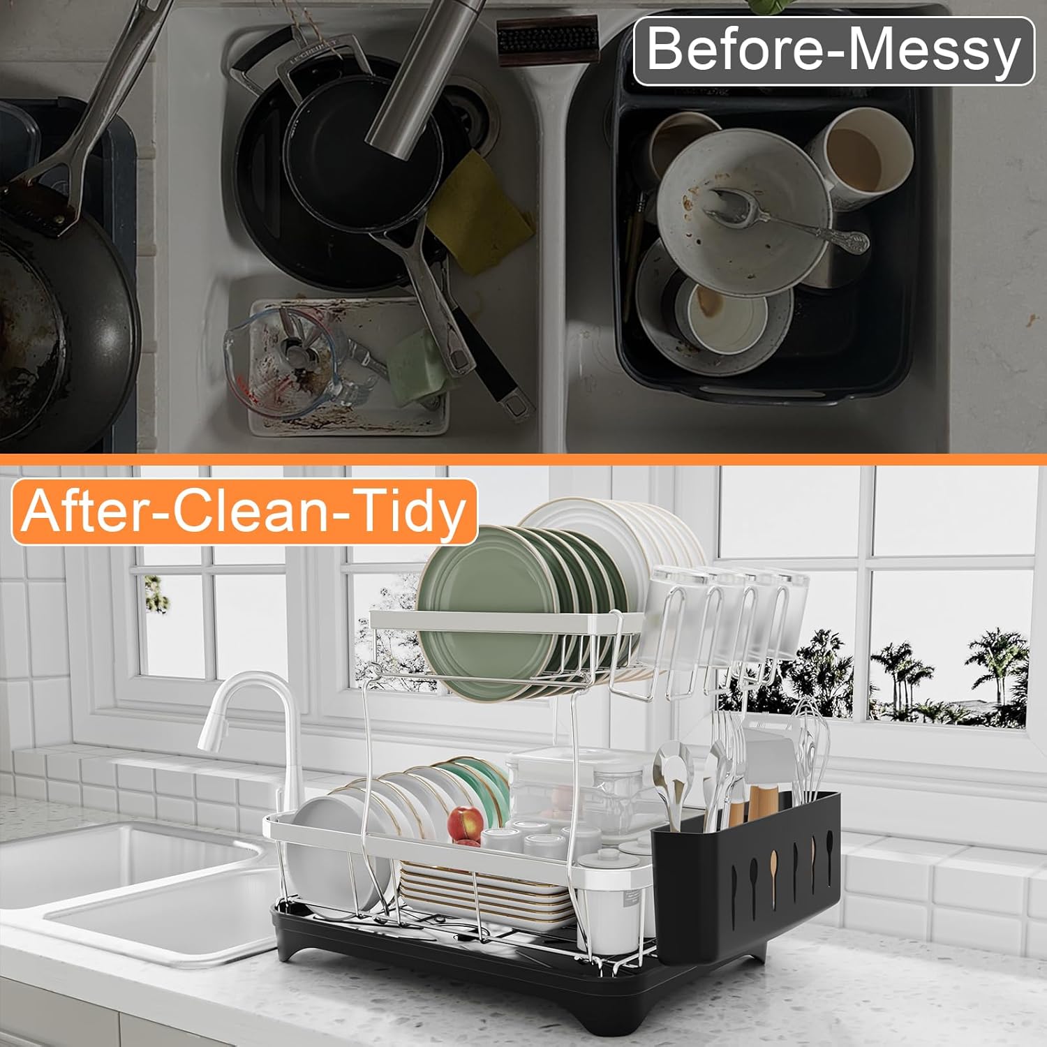 - Large Capacity 2-Tier Dish Rack : With a practical 2-tier design and a size of 16.5 "L x 12" W x 13.3 "H, the dish drainer for kitchen counter enables you to store different types and sizes of kitchenware, such as bowls, dishes, knives, wine glasses, kitchen pots, and frying pans. This 2-tier dish drying rack is perfect for families of 3-4 people.