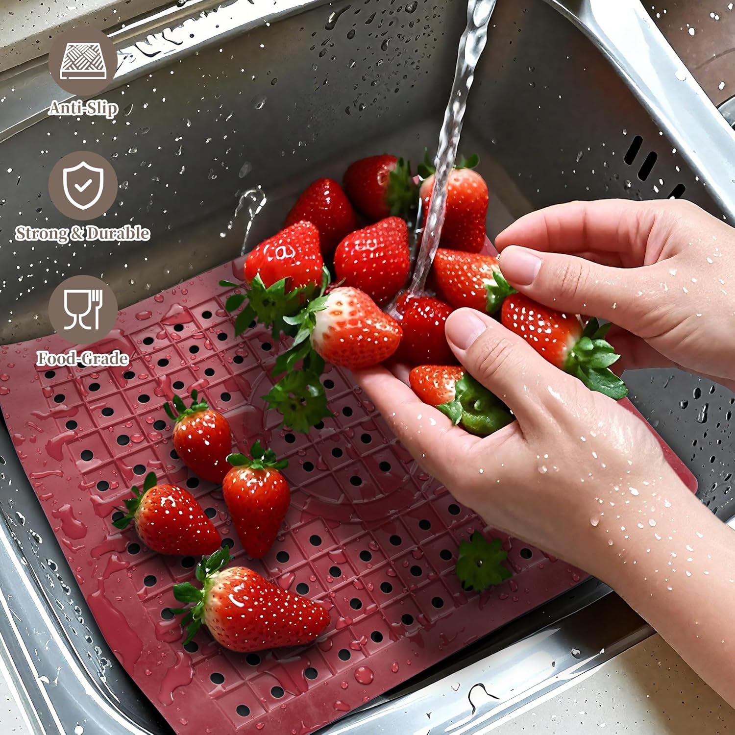 - 【Rubber Sink Drain Mat】 Made from durable rubber material, this sink mat is soft and resilient. Its flexibility allows to be folded and stored without leaving any creases, while its tear-resistant properties ensure it remains intact even with long-term use. Also, the kitchen sink mat features a special non-slip design on its surface, enabling it to firmly adhere to various countertops, providing stable support and preventing slipping.