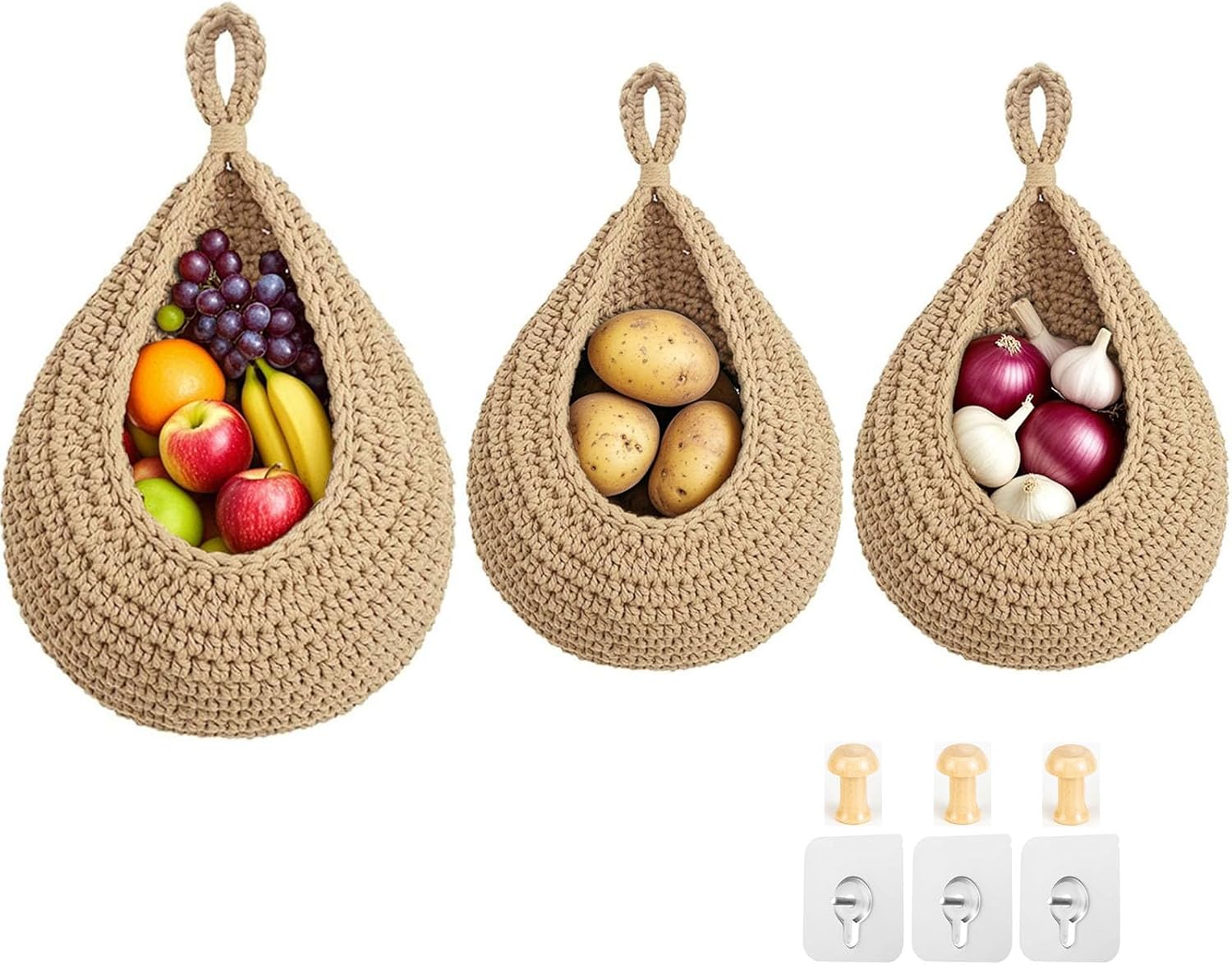 Halidali Hanging Fruit Baskets for Kitchen, 3 Pack Boho Cotton Rope Handwoven Vegetable Storage Wall Mounted Large Organizing Basket for Farmhouse Decor, Onion, Potato, Garlic and Plants (Linen)