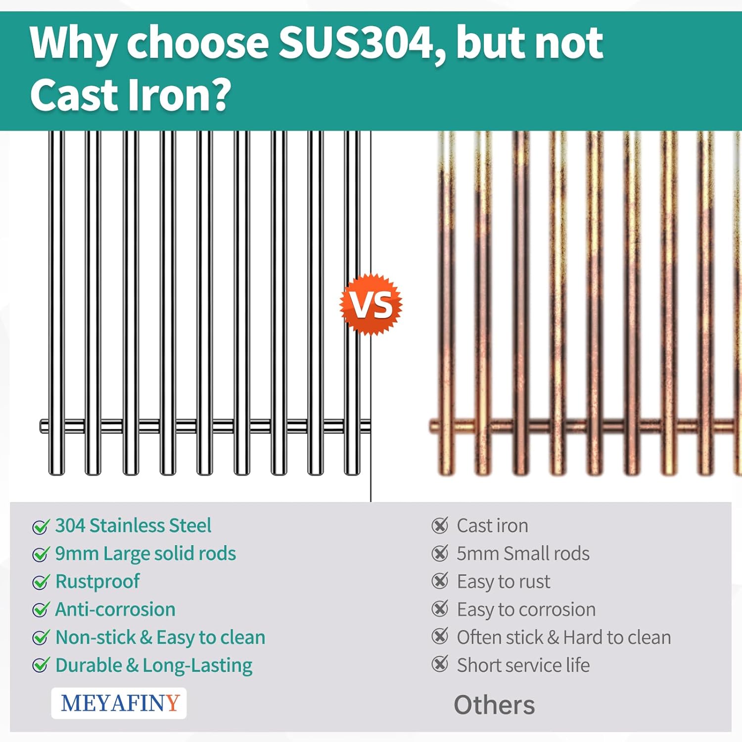 - 【Edge Grinding Design & Protect Your Hands】Our cooking grill grate is free of sharp edges, made with nice welds and smooth surface, no sharp edges and will not hurt your hands. Meyafiny spirit grill grates are made of high-quality 100% food grade 304 heavy stainless steel and well-engineered to prevent rust, which is durable with uniform heating and high corrosion resistance, non-magnetic, much more heavier and heavy duty. Best choice for your Weber Spirit 200 series gas grills.