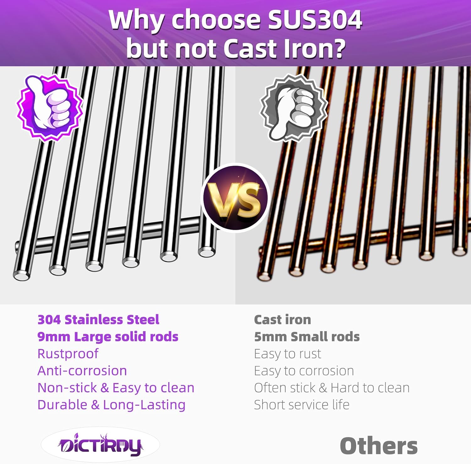 - 【9MM Diameter Solid Rods】Thickness of Dictirdy cooking grate is 9MM, more thicker and stronger than other 5mm/ 7mm grill grates. Our barbecue cooking grids feature SUS304 thicken solid rod bars, which are not easy to deform and more durable for long time using.
