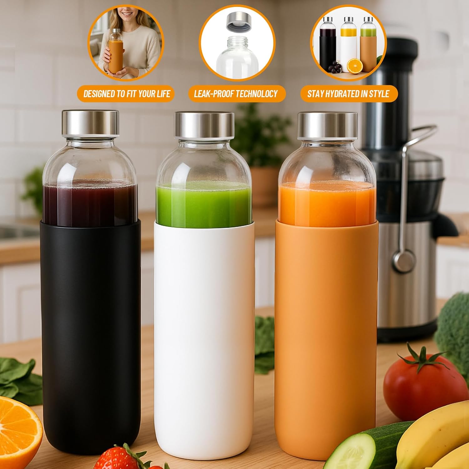32 oz Clear Glass Bottles with Lids and Silicone Sleeve, Reusable Refillable Water Bottles for Juicing, Refrigerator,100% Leak Proof, BPA Free, Juice Glass Set of 3
