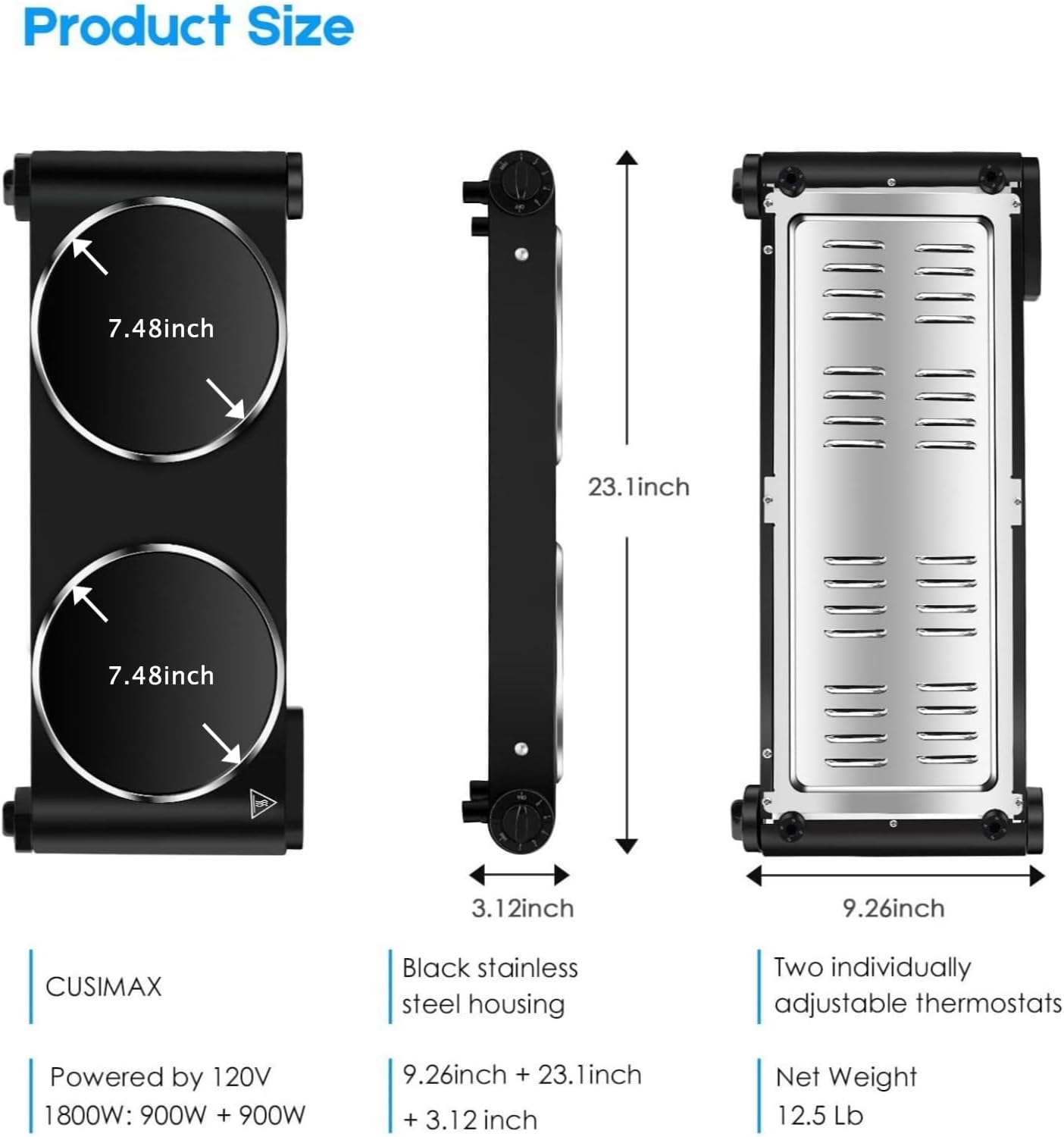 - 【Lightning-fast Heating】 Compare to Cast-iron hot plate burner which takes minutes to heat up, Infrared burners takes few seconds to heat up. Powered by 120V and 900-Watts (left plate) + 900-Watts (right plate), add up to 1800W. Cook food including warm sauces, scrambled eggs, grilled cheese, boil water, make soup, cook pasta and vegetables. Tip: Use a lid to boil water faster!