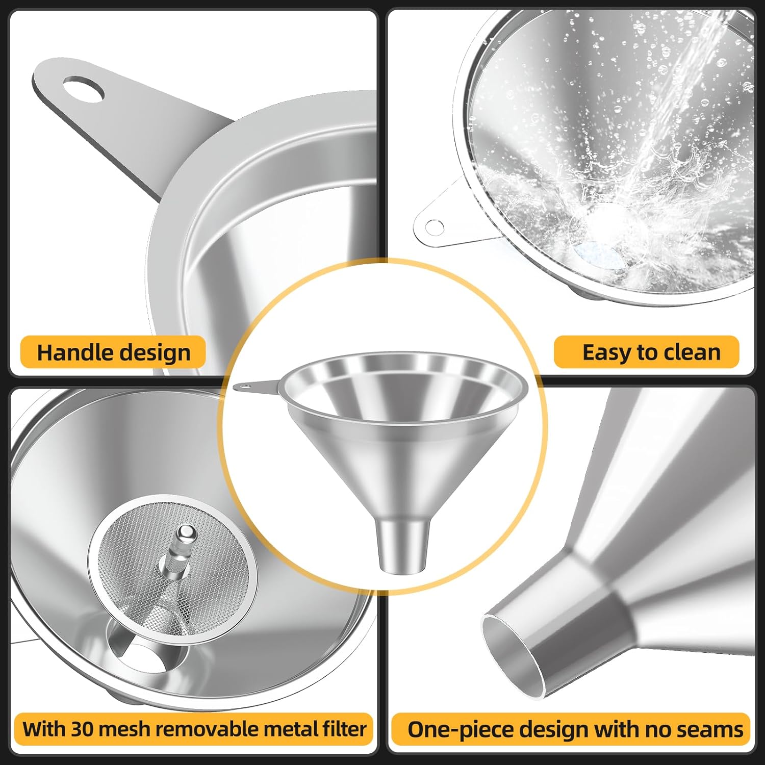 • MULTI-PURPOSE HOME ESSENTIAL: Whether you're filling spice jars, transferring cooking oil, or pouring liquids into bottles, the included removable 30 mesh stainless steel strainer makes it easy to filter out food scraps and fruit particles, these funnel kits are a must-have for you.