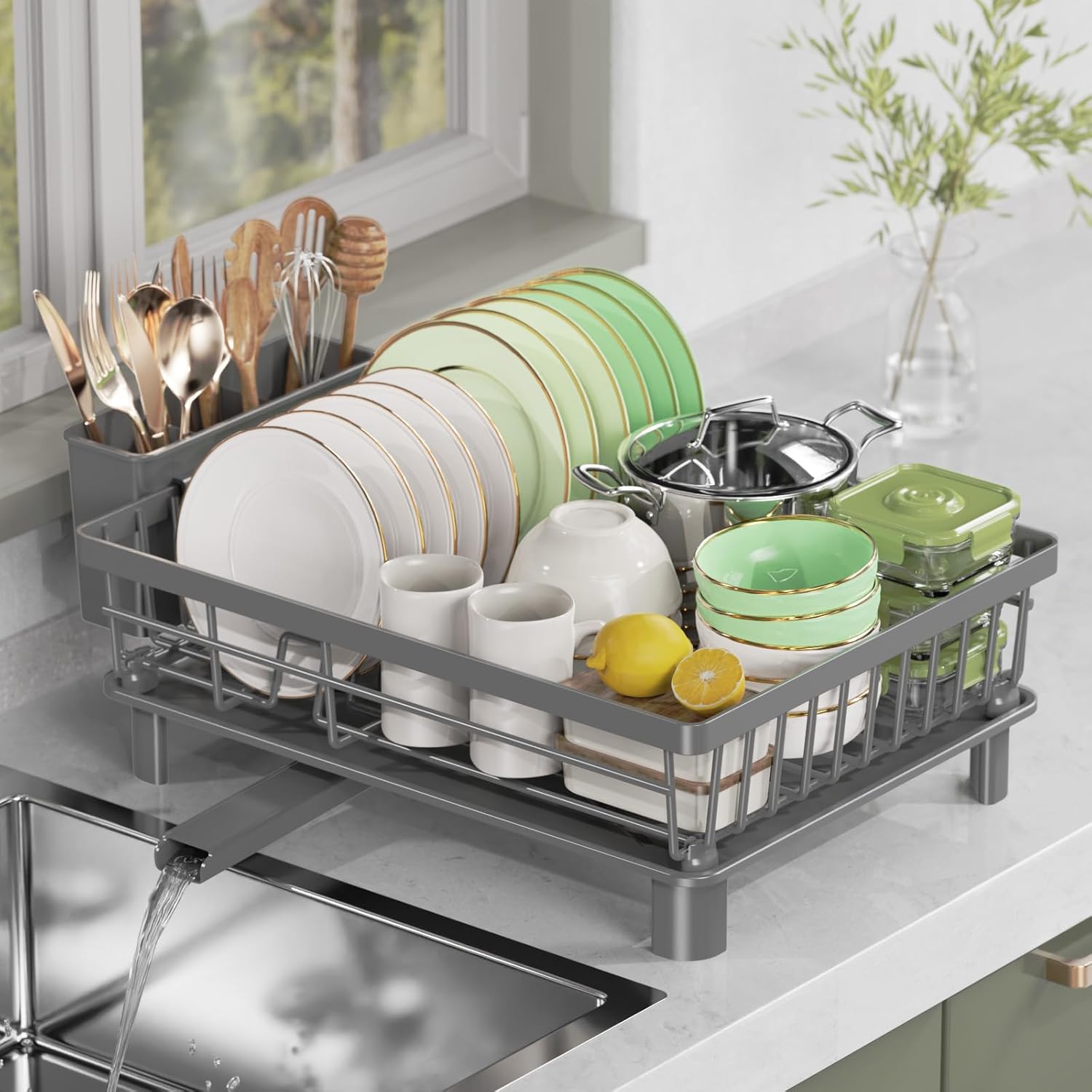 - 【Upgraded Drainage System】 Keep your countertop dry and tidy! Our dish rack features a removable drain board that channels water efficiently to the spout. The improved cutlery tray includes drainage holes, directing water down to the drain board below. This integrated system ensures quick drying and effortless cleanup.