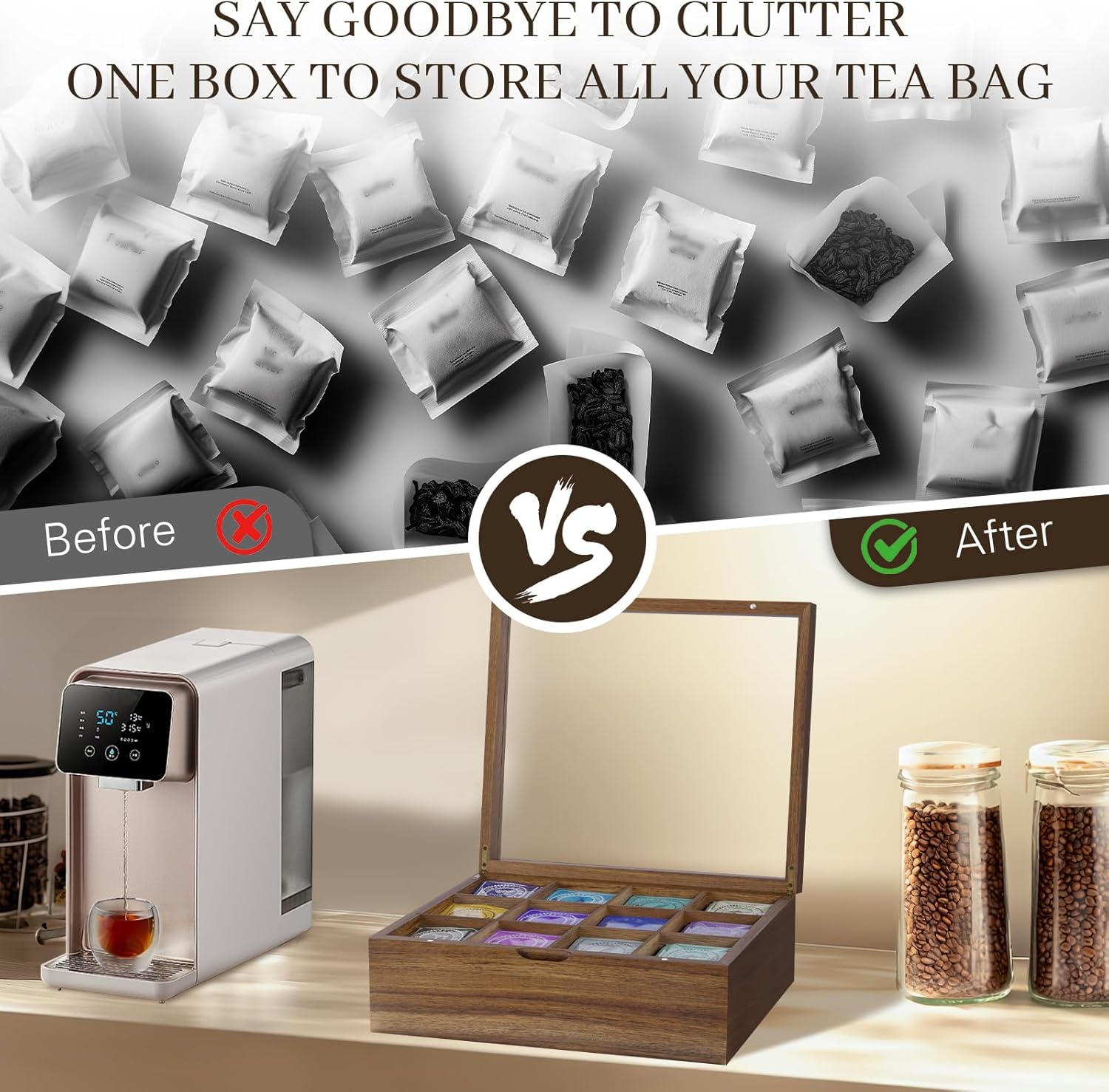 Acacia Wood Tea Bag Organizer, 12 Compartments Tea Box Organizer Storage Box, Teabag Holder Organizers with Clear Acrylic Window, Magnetic Lid and Removable Dividers