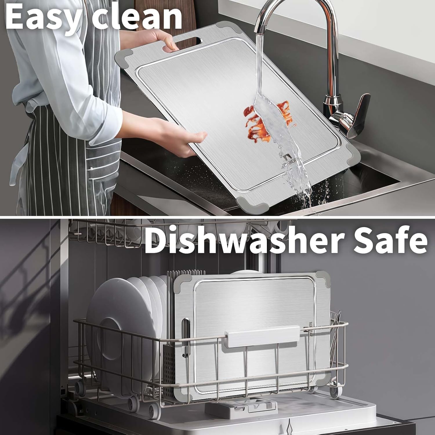 - EASY TO CLEAN-Compare to traditional wooden cutting boards that are easy to leave food residue in the crevices and plastic chopping boards that are prone to crumbs, while the titanium surface is very easy to clean and can be washed thoroughly.