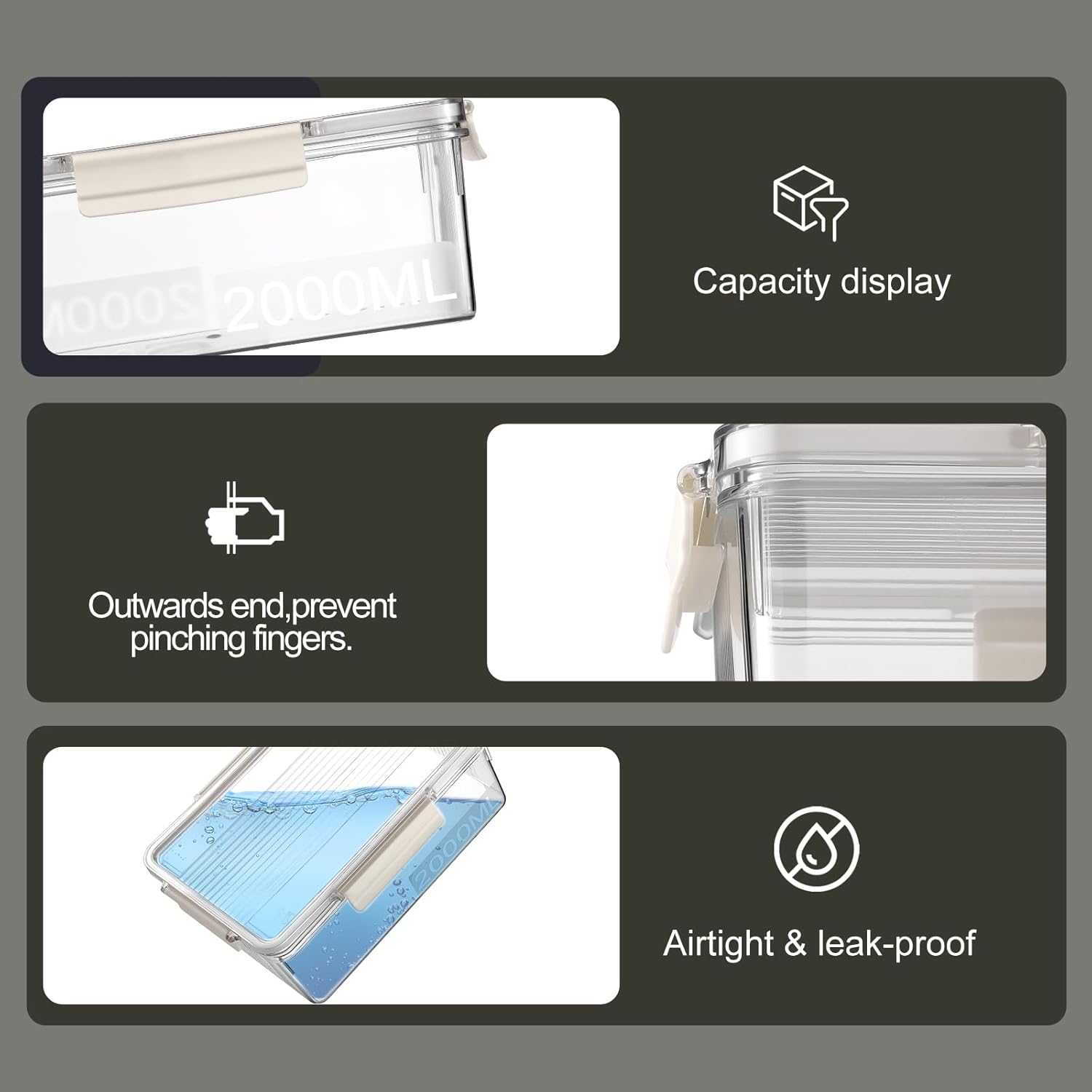 - User-Friendly: The Eclirgan freezer storage container is rectangular and nest,easy to store in cabinets and fridges. The figures on the box show the storage capacity: 500 ml (0.5 QT / 2 Cup / 16 OZ), 1000 ml (1 QT / 4 Cup / 33 OZ), and 2000 ml (2 QT / 8.4 Cup / 67 OZ), meeting different needs of use. The end of the snap lock is spread outward, easy to open.
