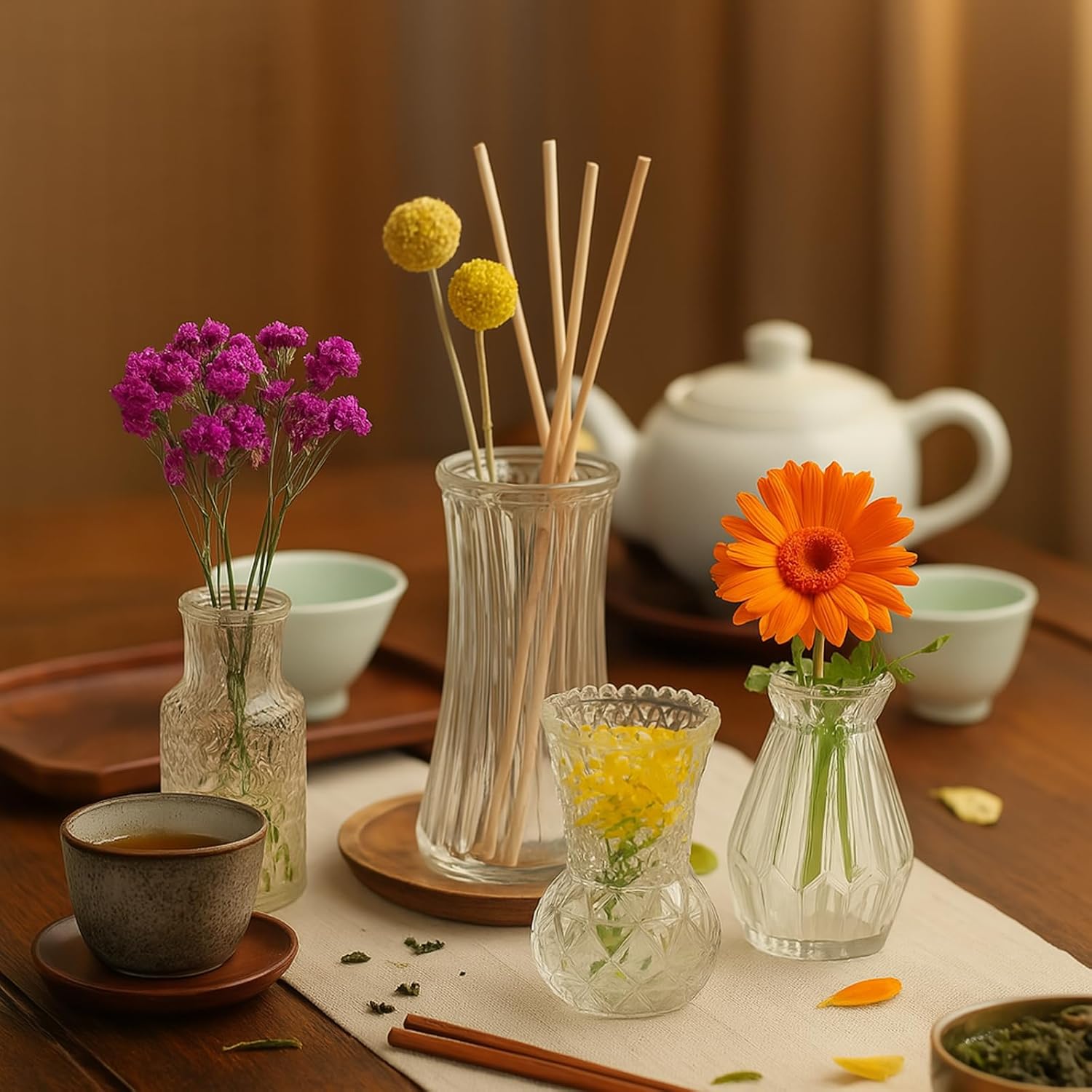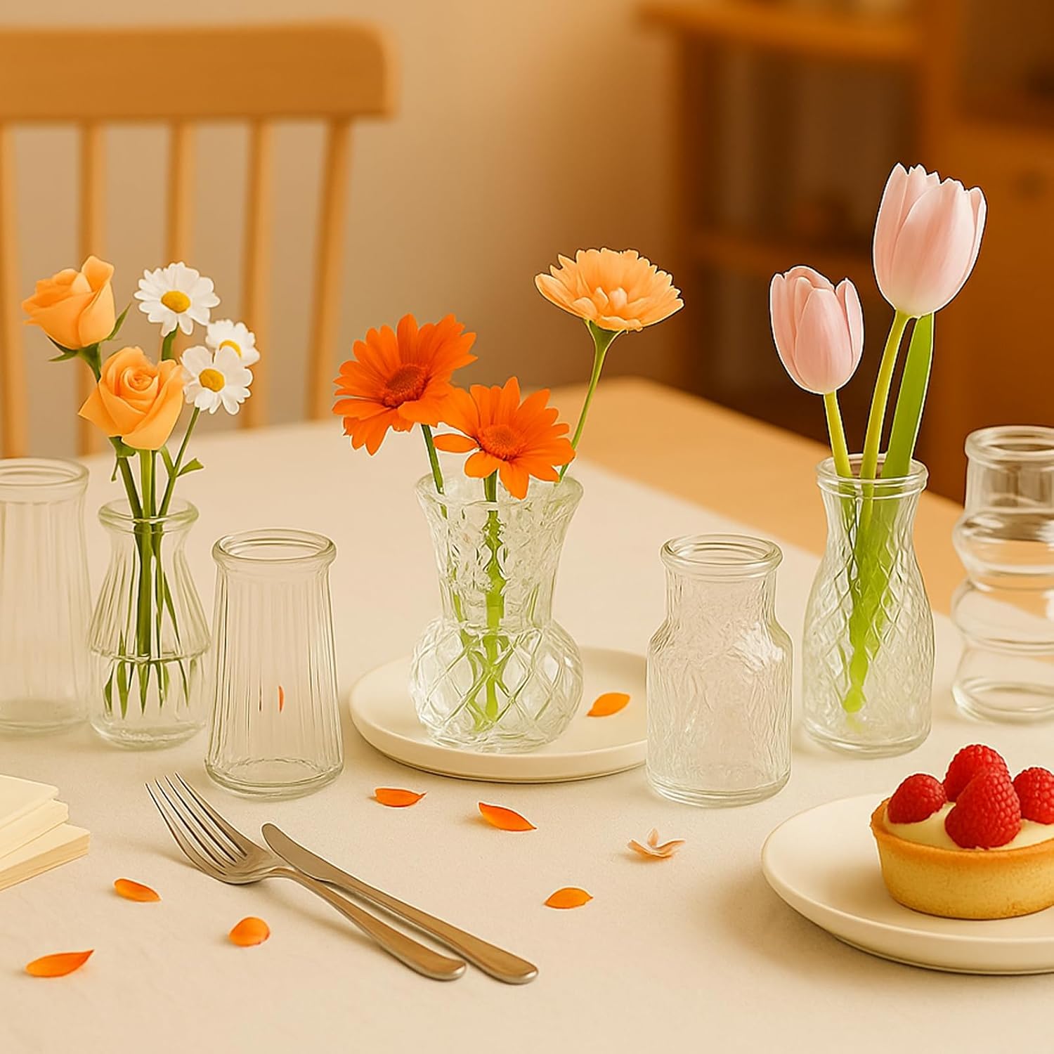 - Versatile Decoration: These clear glass vases can be used for fresh flowers, silk flowers, dried flowers, greenery, branches, feathers, or other decorations. Fill these bud vases with essential oils to enjoy your favorite fragrance. You can insert any kind of flowers or greens to make your home look bright and cozy.