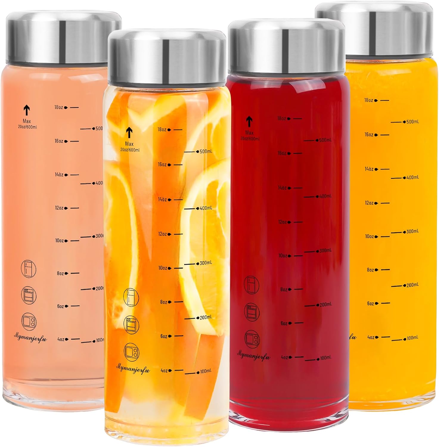 Glass Juice Bottles 4 Pack 20 oz - Wide Mouth Glass Water Bottles with Lids - for Juicing, Smoothies, Milk, Protein, BPA Free, Reusable, Stainless Steel Lids, Leak Proof, Shaker bottle [20oz/600ml]