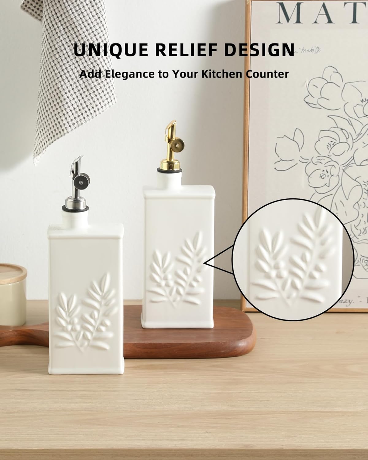 - Excellent Relief Design: This olive oil dispenser bottle design with exquisite olive leaves relief patterns, and the bottle body is hold easily. The mouth design makes it easy to open and close, keep dust out, pouring fluid is smooth without sticking and control of the use of oil