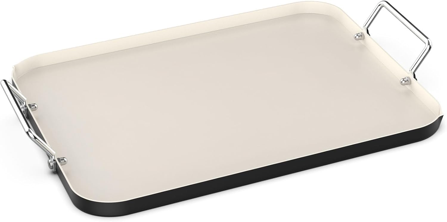 - ✅The surface of the nonstick griddle pan is coated with a ceramic coating. The ceramic coating is free of PFOA, PTFE, lead, cadmium, or other toxic metals, meeting food contact safety standards