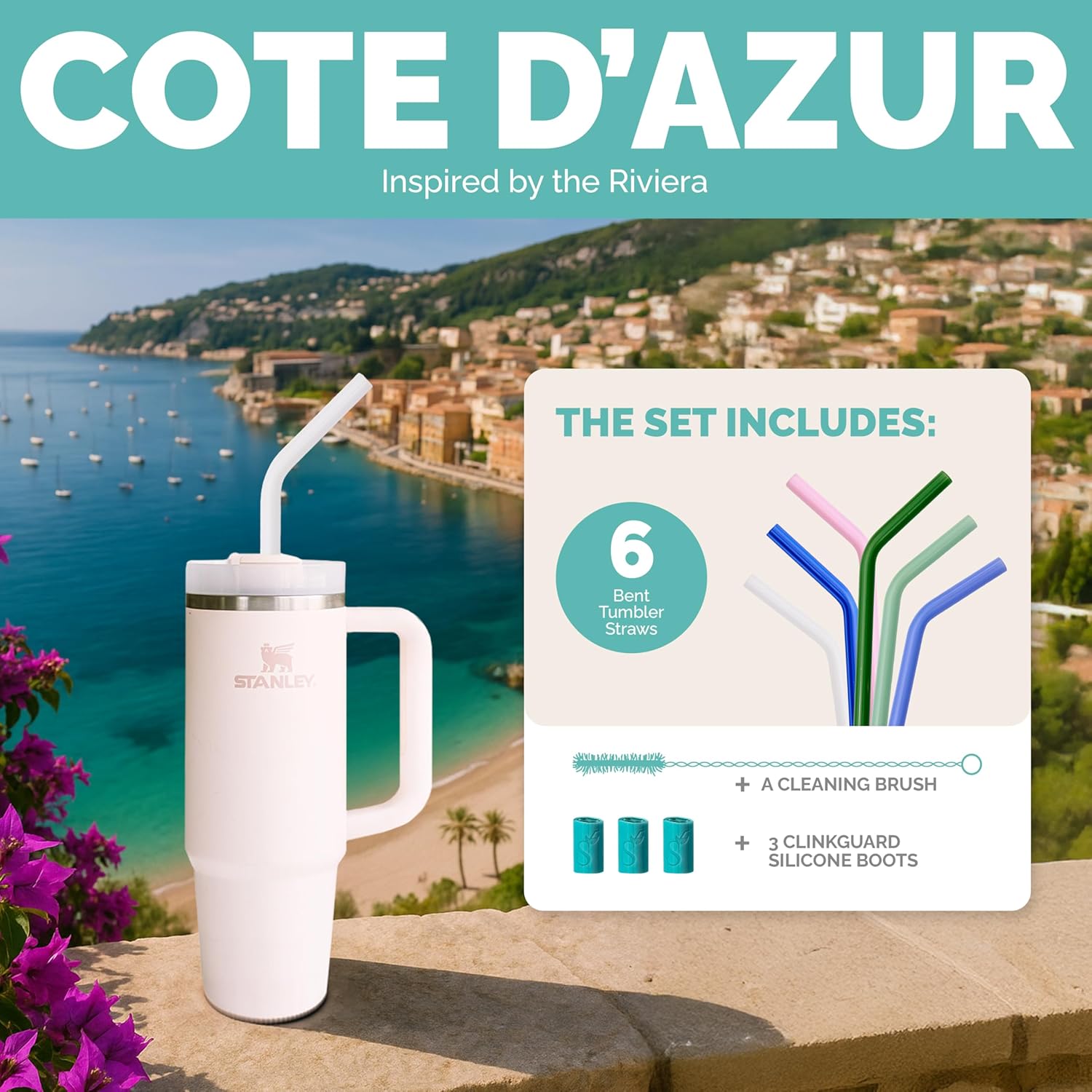 Simply Straws 12 Inch Glass Straws Bent (6-Pack) – Reusable Glass Straws for Stanley 40 Oz Tumbler, with Cleaning Brush – Durable, Dishwasher Safe, Hot & Cold Use, BPA-Free (Cote d'Azur)
